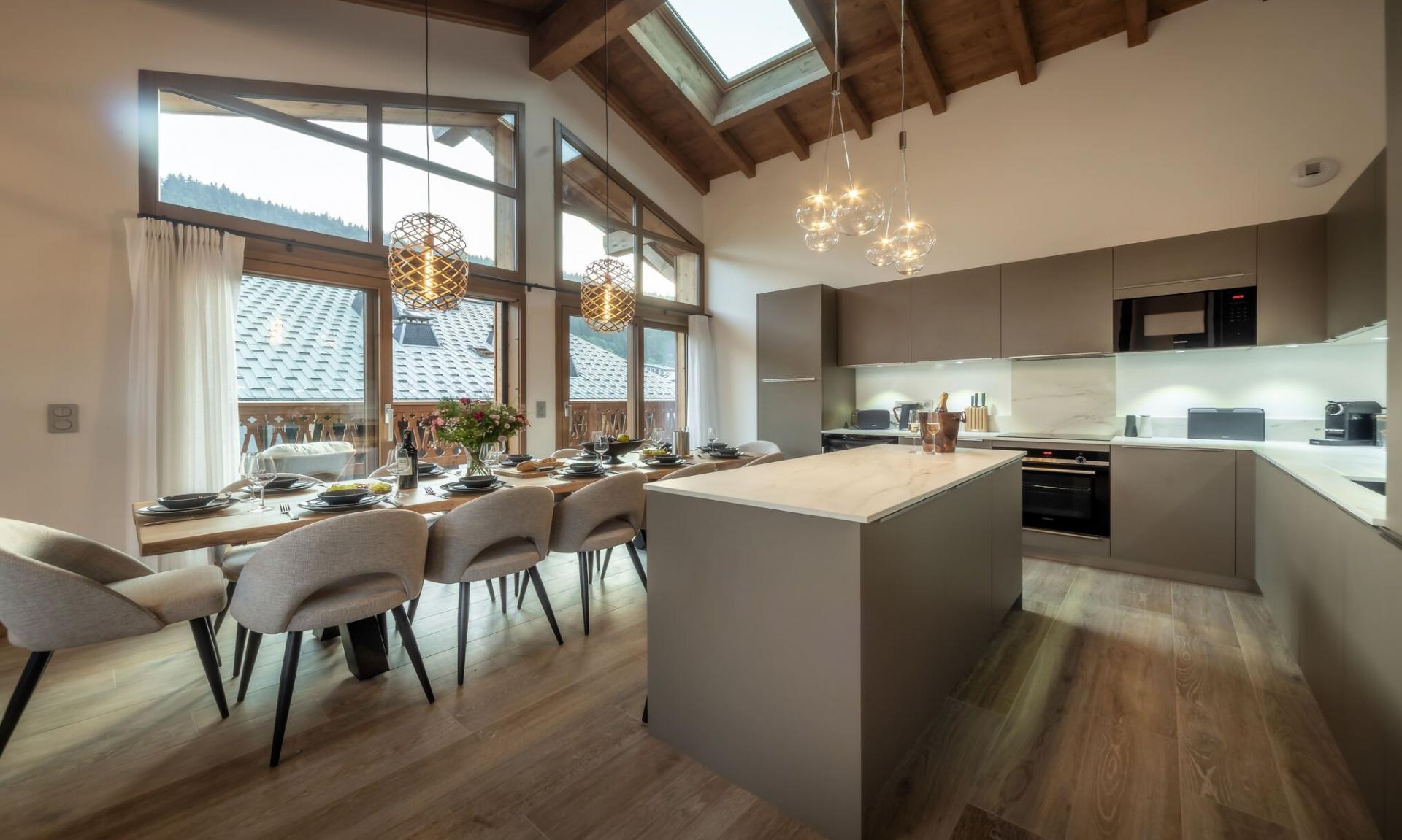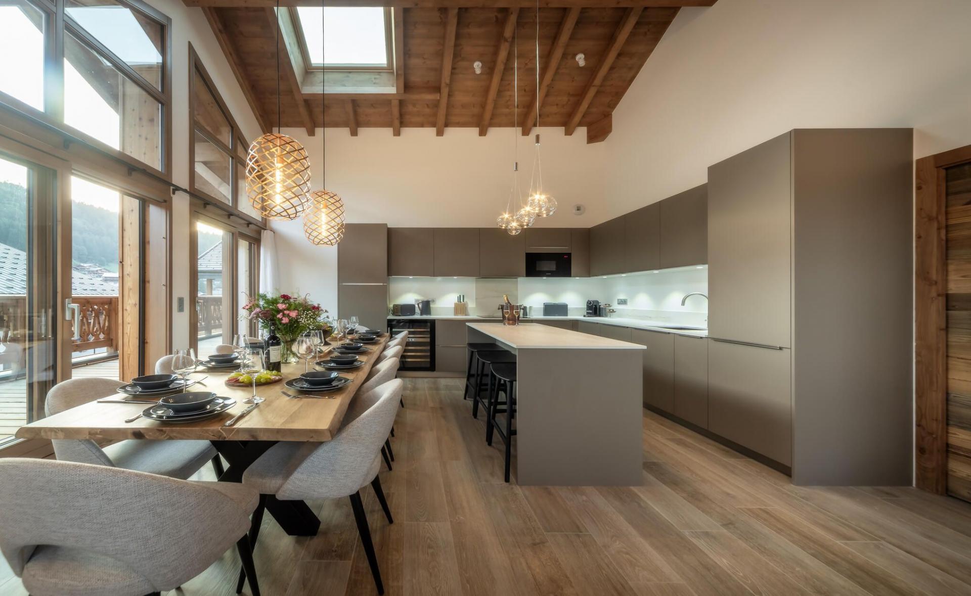 The 160m² penthouse exhibits an elegant alpine style and contemporary furnishings, best showcased throughout the open-plan living areas of the property. Due to its penthouse nature, the main living area can take advantage of double-height vaulted ceilings, with skylights that help open out the space even further. The interiors are a mix of refined wood and white walls, with one aspect of the lounge area dedicated to sizeable picture windows that showcase views across to the Pleney and lead out to a balcony. Two lounge areas sit side-by-side, one with sofas positioned towards a TV area and the other towards an authentic log burner that is sure to warm you up on chilly winter nights. The kitchen-dining area is modern and understated. The dining table easily seats all 12 members of your group, while the kitchen is fully-equipped with a stylish matte finish. Another aspect of windows helps illuminate this space with natural light, also leading out onto the apartment's wraparound balcony. The balcony extends to three sides of the apartment, offering views over the resort to the surrounding peaks and lifts.