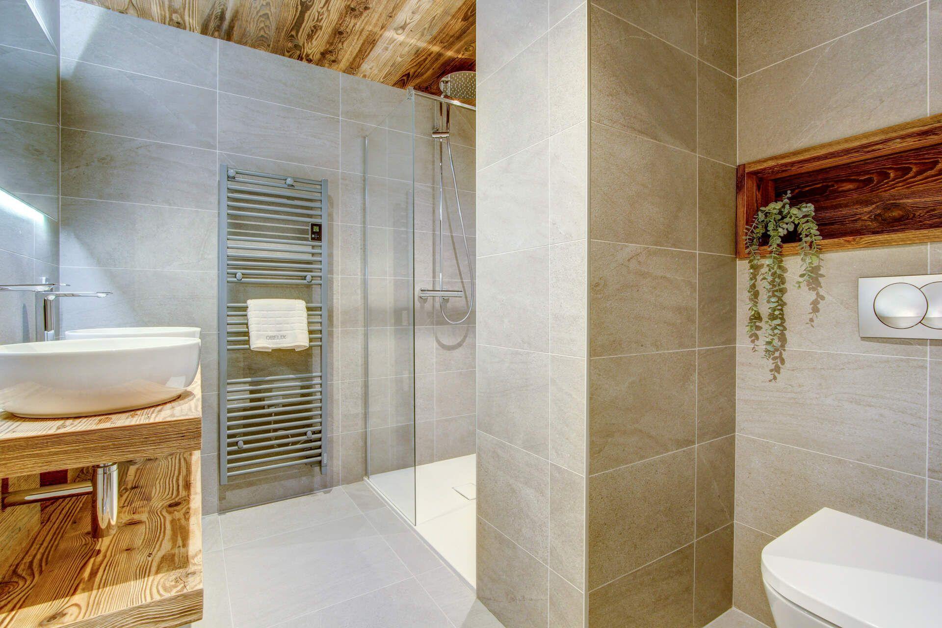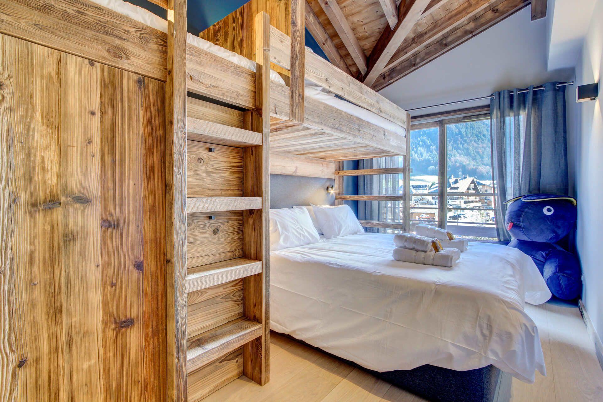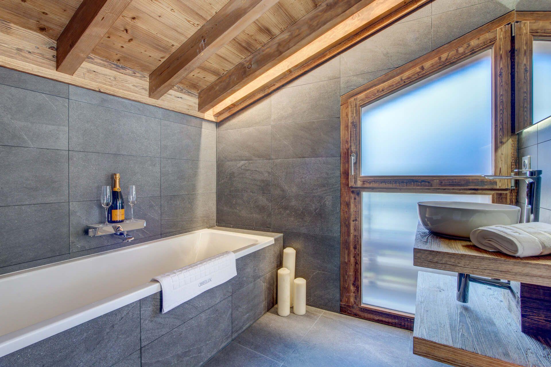Penthouse Obelix can accommodate groups of up to 12 guests total, spread across five double bedrooms. One of these bedrooms is on the upper level, with the other four occupying the lower level of the penthouse. The bedrooms have an understated elegant alpine style, combining wood interiors and contemporary, comfortable furnishings. Four of the five double bedrooms can also be taken as twin rooms, with one of these rooms providing two overhead bunks, ideal as a family suite. All bedrooms have their own en-suites, with several also providing balcony access.