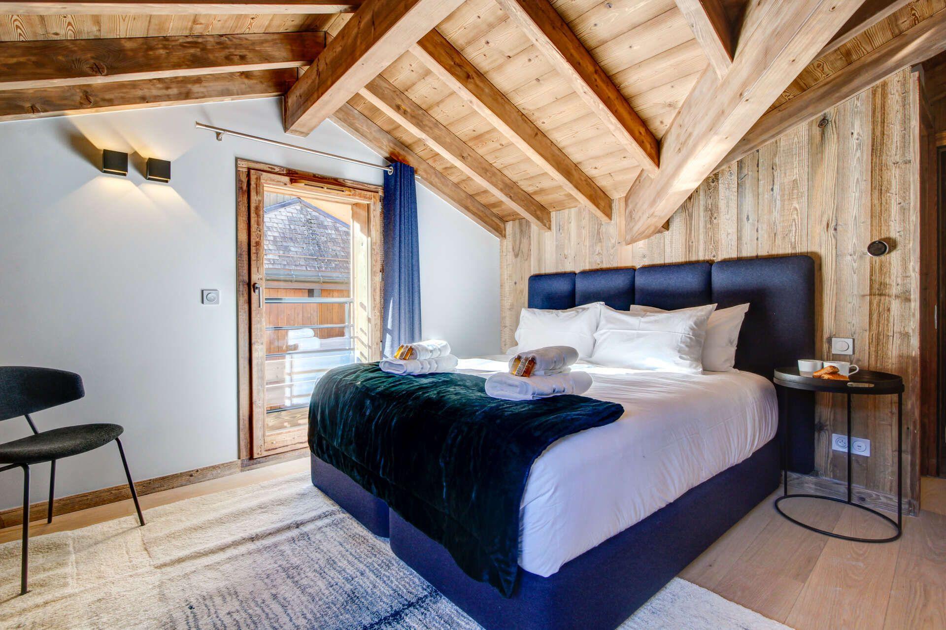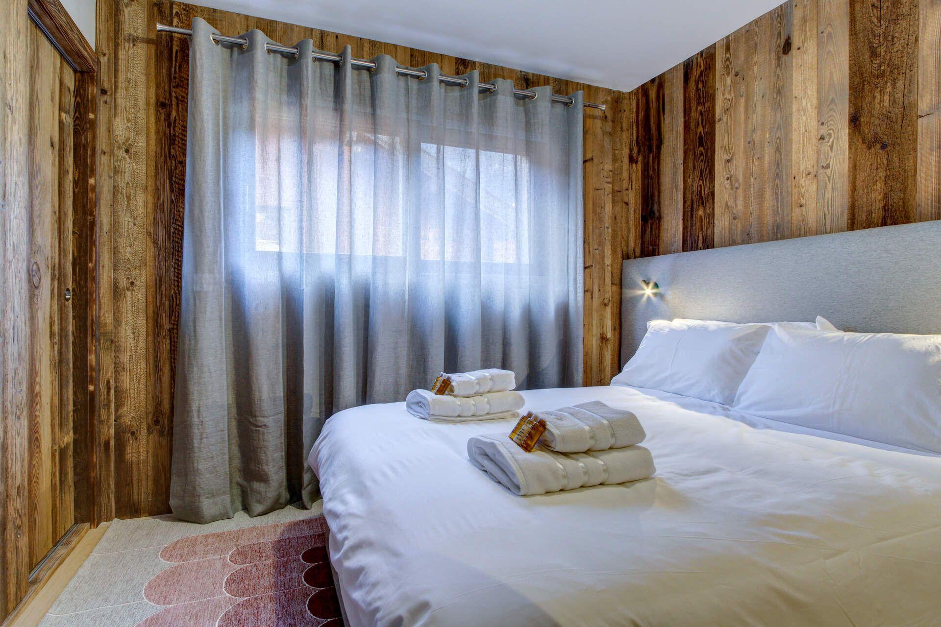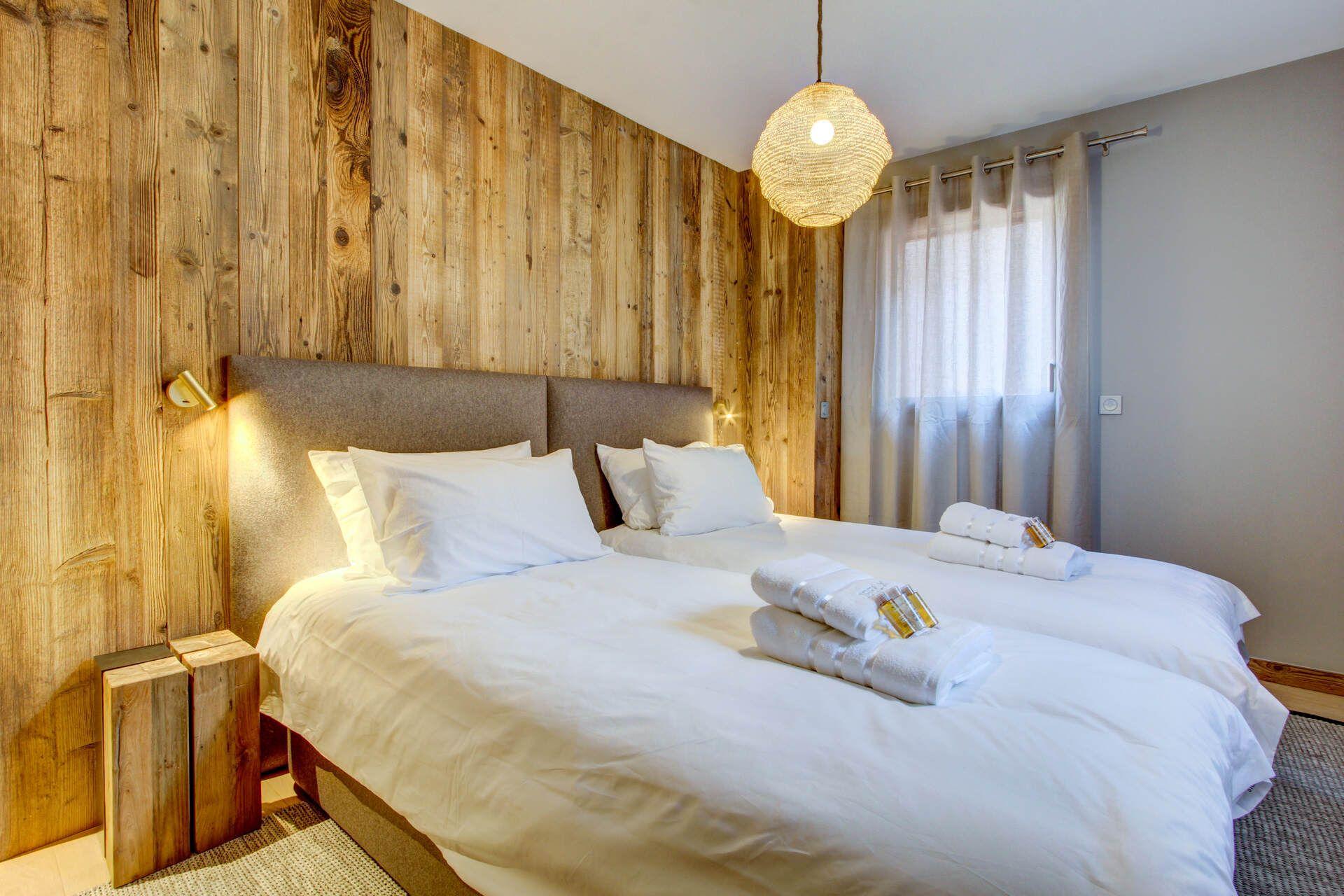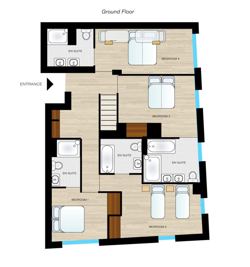 Penthouse Obelix can accommodate groups of up to 12 guests total, spread across five double bedrooms. One of these bedrooms is on the upper level, with the other four occupying the lower level of the penthouse. The bedrooms have an understated elegant alpine style, combining wood interiors and contemporary, comfortable furnishings. Four of the five double bedrooms can also be taken as twin rooms, with one of these rooms providing two overhead bunks, ideal as a family suite. All bedrooms have their own en-suites, with several also providing balcony access.