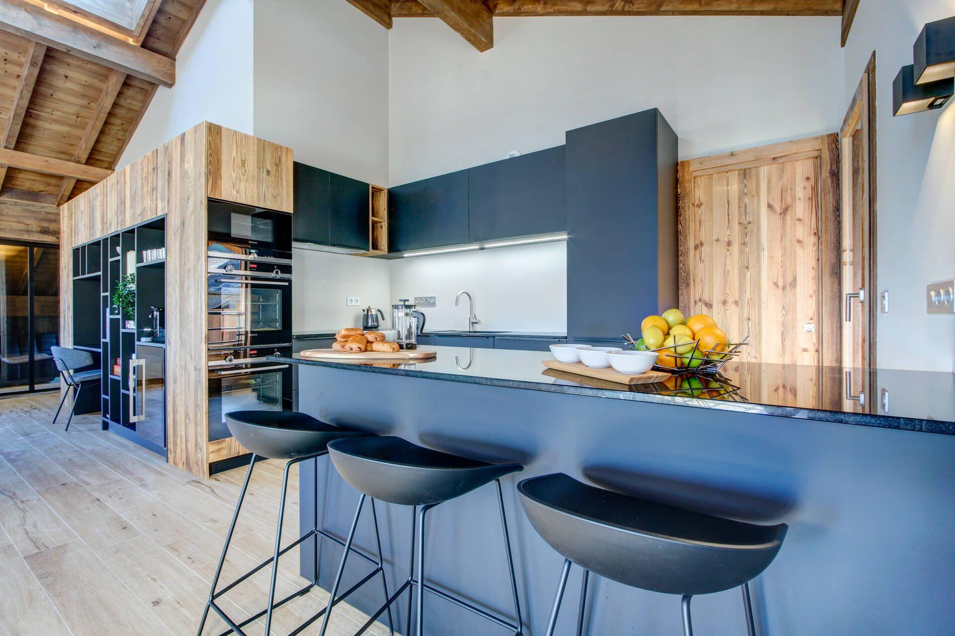 A duplex penthouse apartment, you will find the main living spaces of Penthouse Obelix across its upper level. The living space will astound you upon entering, with double-height ceilings, sizeable windows across all aspects, and bold, luxurious furnishings. With an open-plan layout, and a stylish suspended log burner fireplace, this space invites you to relax and socialise together as a group, whether sinking into the plump, lavish lounge sofas or dining together as a group around the dinner table. A fully-equipped kitchen with breakfast bar can also be found in this sumptuous living space. A sizeable balcony extends off this living area, where you will find comfortable outdoor seating to unwind on, with glorious views over Morzine and down the valley to be enjoyed.