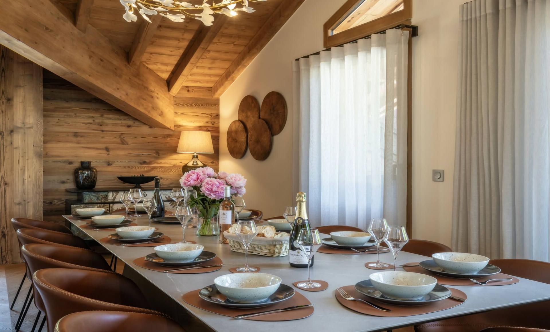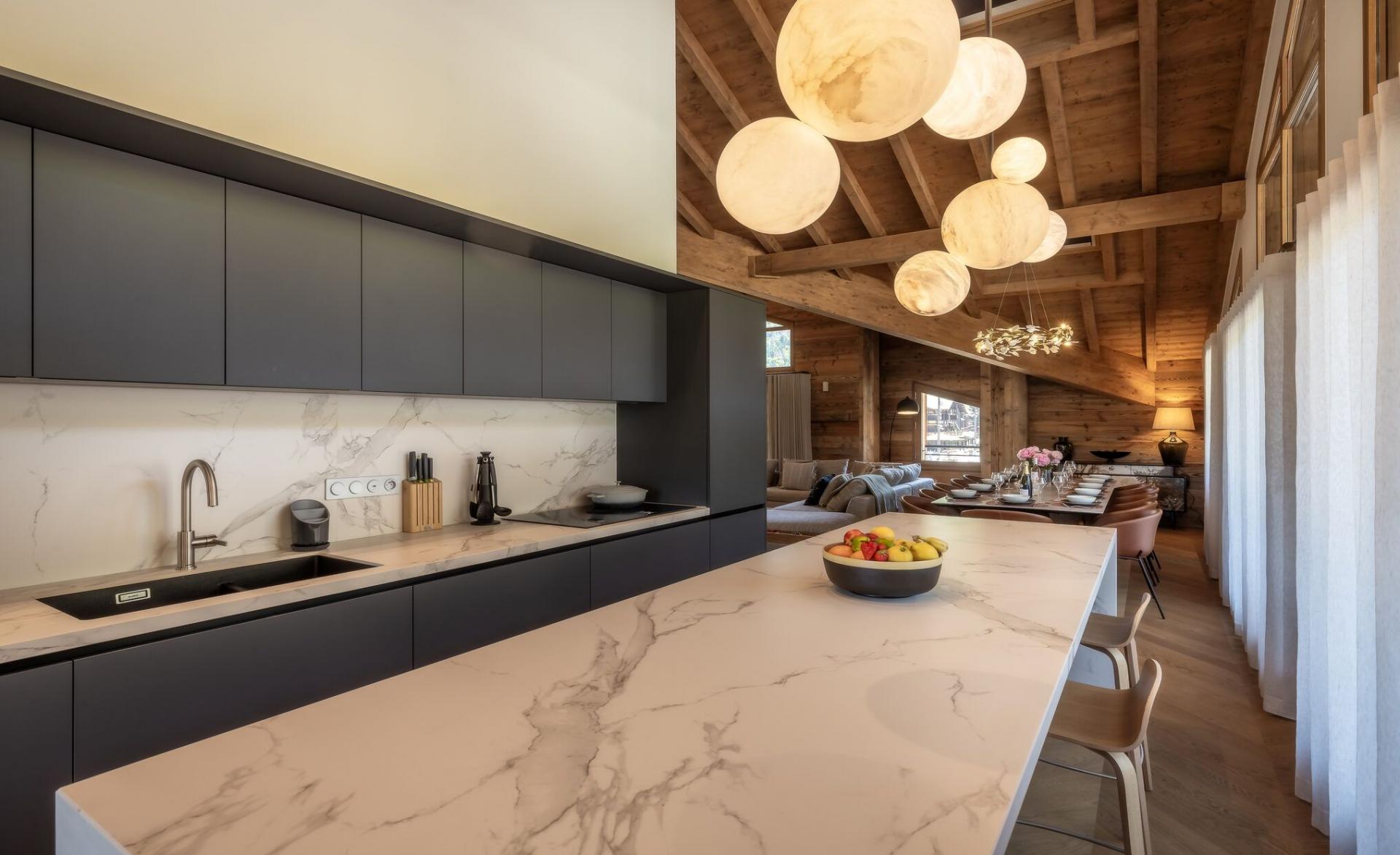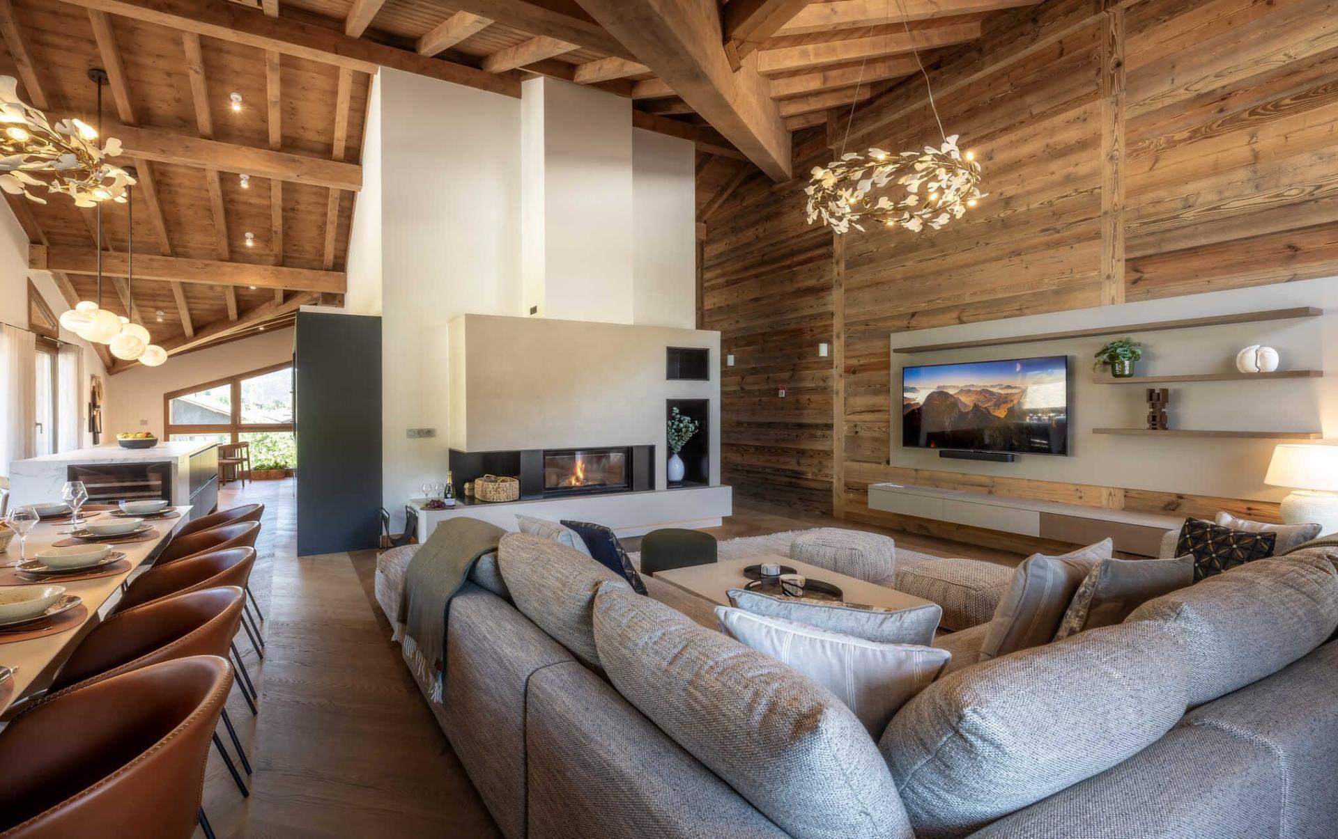 While set over two levels, the majority of Penthouse Snowgum's 172m² is found on the upper level of the duplex apartment, which is where you will find the stylish main living areas of the property. Benefitting from extra-high wooden ceilings and an open-plan layout, the lounge, dining area, and kitchen form one, free-flowing space. A sumptuous, stone-grey corner sofa sits before the warmth of the apartment's built-in fireplace. The dining table adeptly seats all 12 guests, which is found next to the fully-equipped fitted kitchen with large worktop island for food preparation. Contemporary furnishings and glamorous light fixtures help sell the sense of luxury of this stunning penthouse property. Large windows help stream in natural light, with the apartment providing access to two sheltered balconies, which feature some comfortable outdoor furniture and views towards the slopes of the Pleney and the Pointe de Nyon.