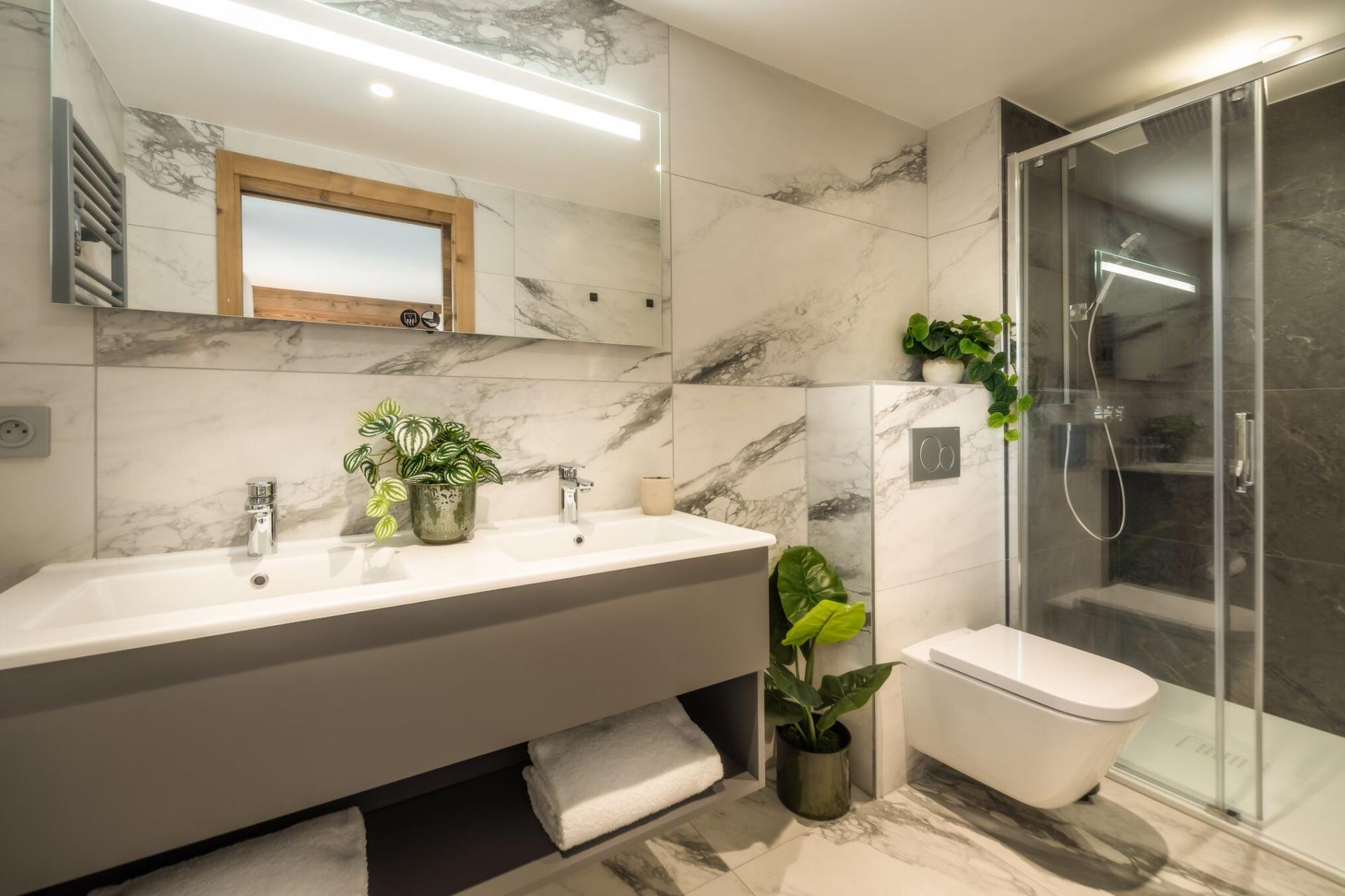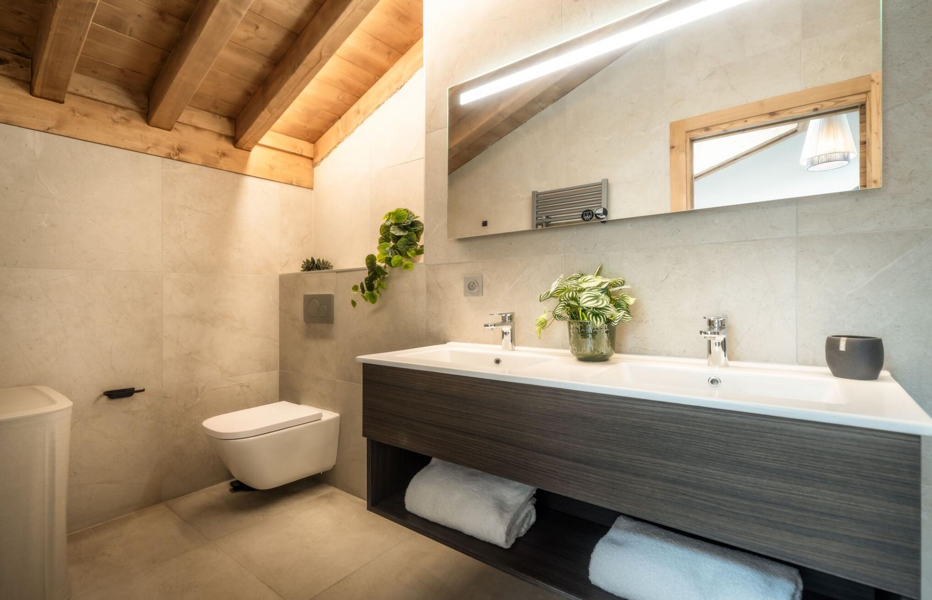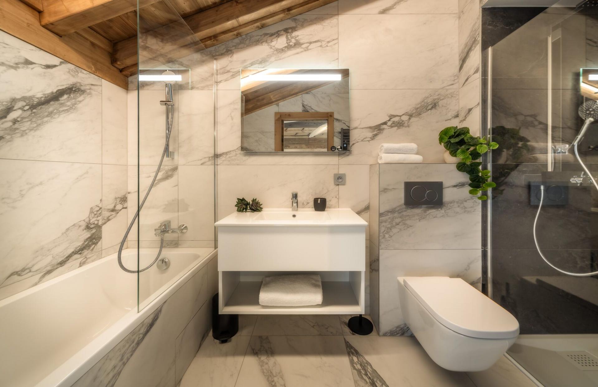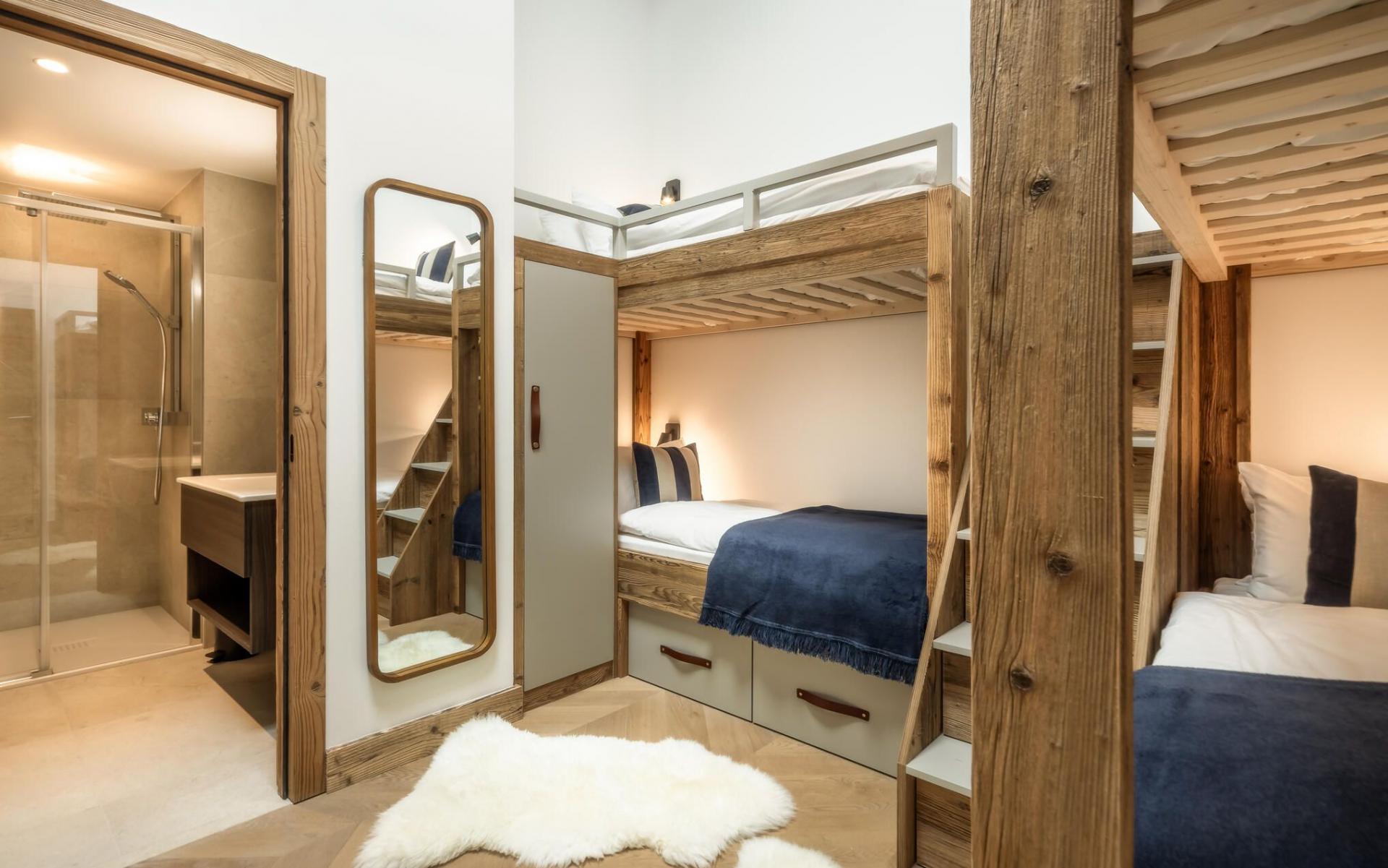 There are five bedrooms to Penthouse Snowgum in total, providing capacity for groups of up to 12 guests. The bedrooms are cosy and charming, with wood-lined interiors, homely beds and furnishings, and each completed by a stylish modern marble en-suite. There are four double bedrooms, all of which can be arranged as twin rooms, and one bunk bedroom for four people, with adult-sized beds. With this flexibility in bed configurations, Penthouse Snowgum is an ideal option for all manner of group makeups for your next luxury ski holiday to Morzine.