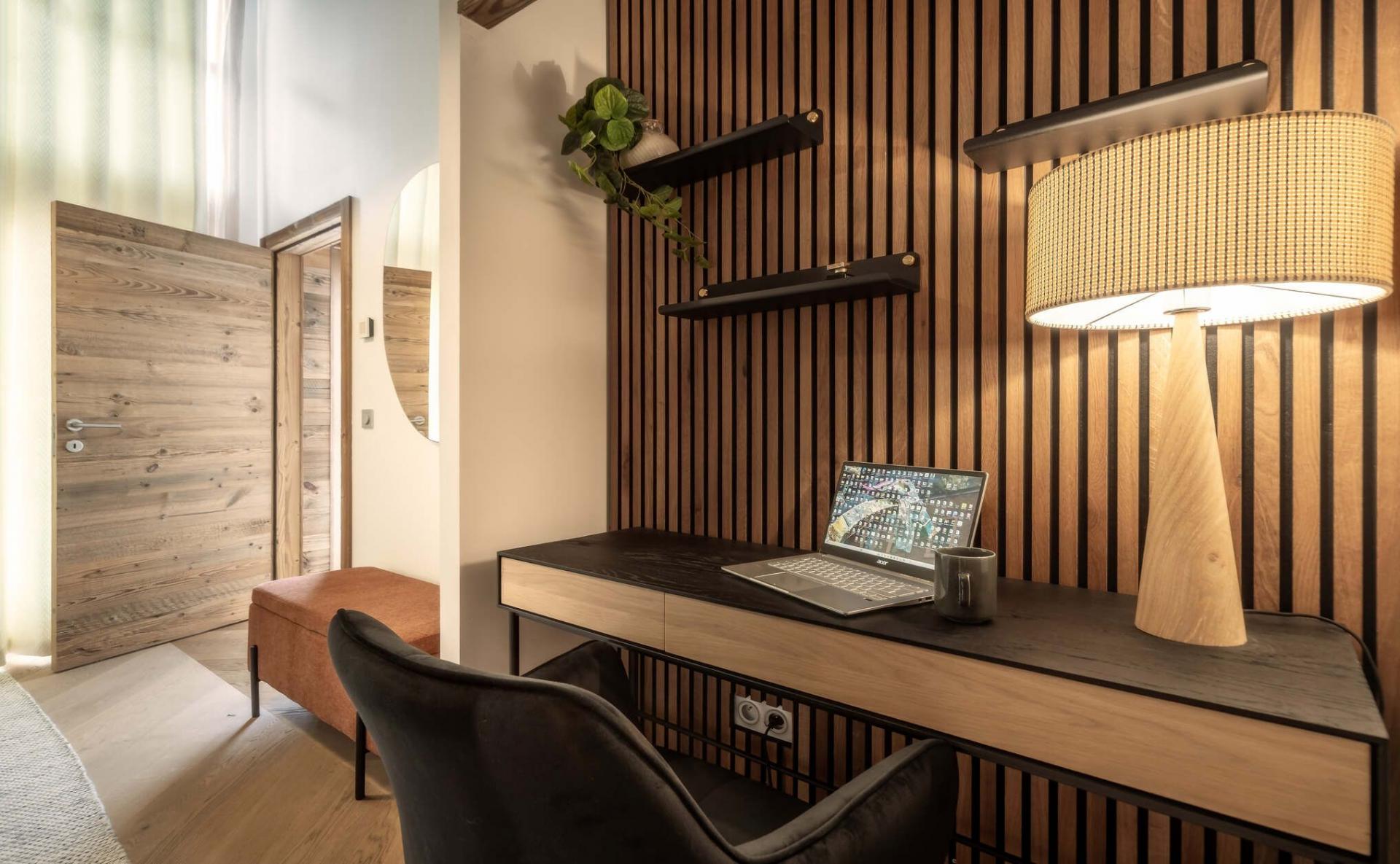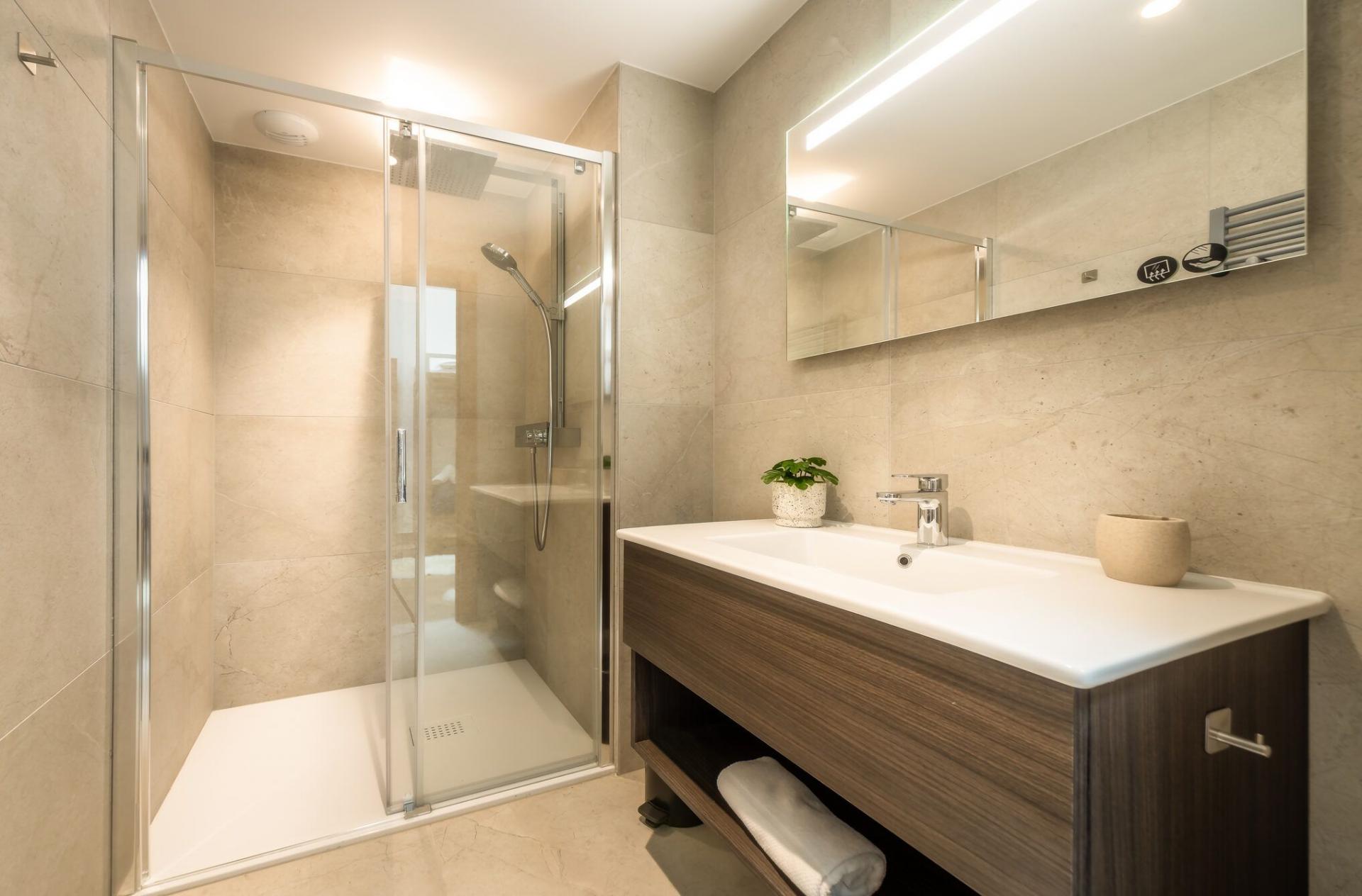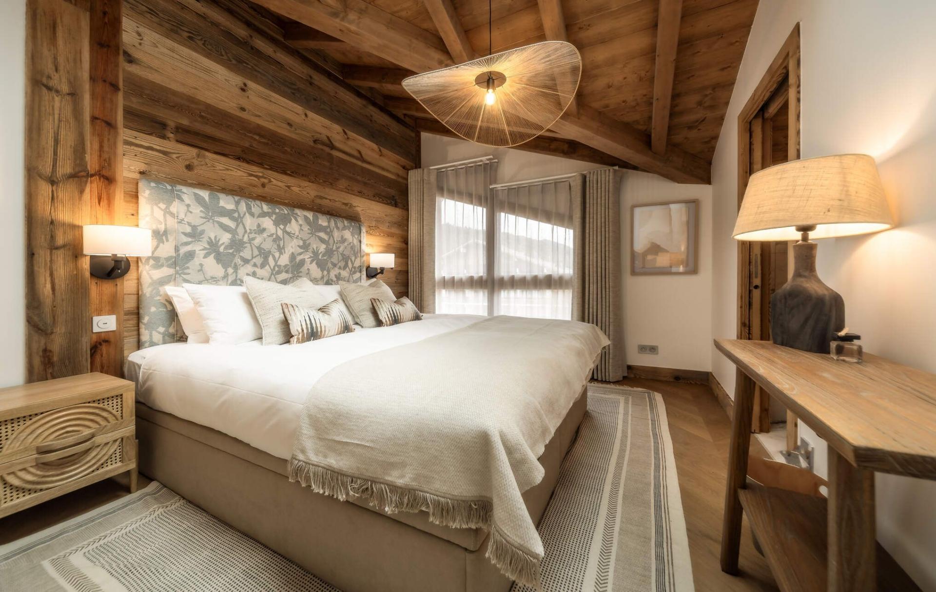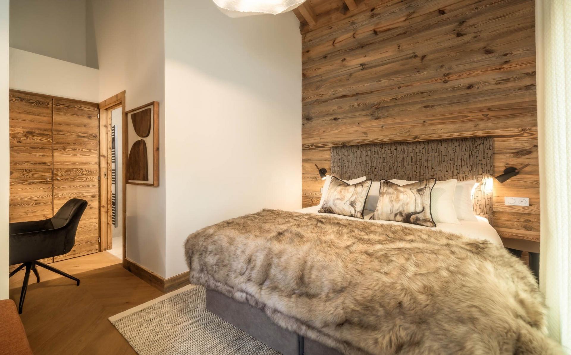 There are five bedrooms to Penthouse Snowgum in total, providing capacity for groups of up to 12 guests. The bedrooms are cosy and charming, with wood-lined interiors, homely beds and furnishings, and each completed by a stylish modern marble en-suite. There are four double bedrooms, all of which can be arranged as twin rooms, and one bunk bedroom for four people, with adult-sized beds. With this flexibility in bed configurations, Penthouse Snowgum is an ideal option for all manner of group makeups for your next luxury ski holiday to Morzine.