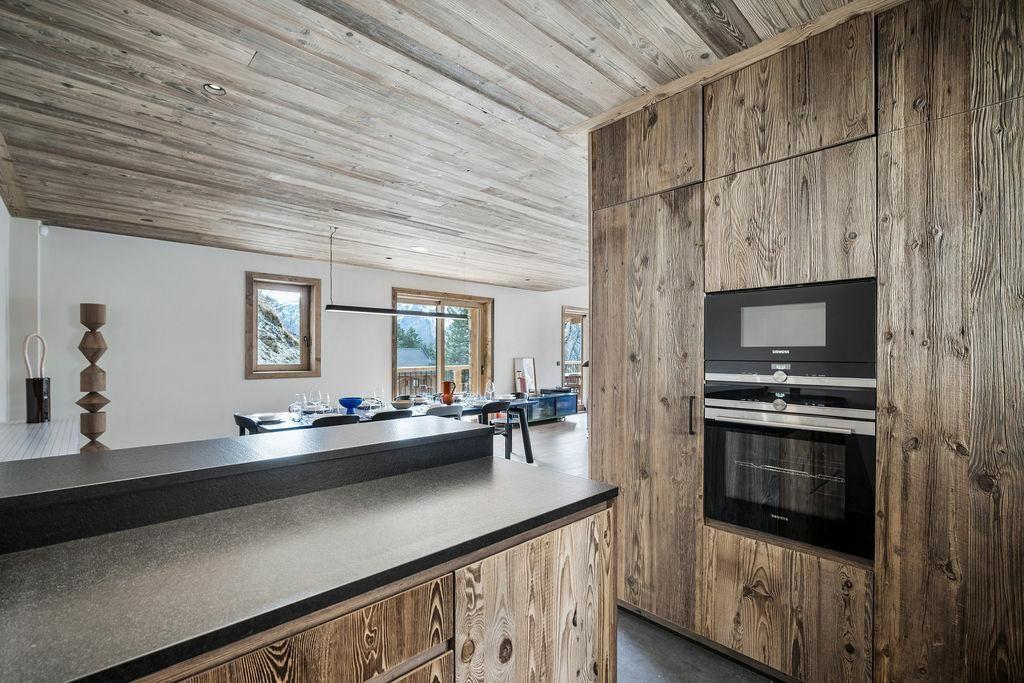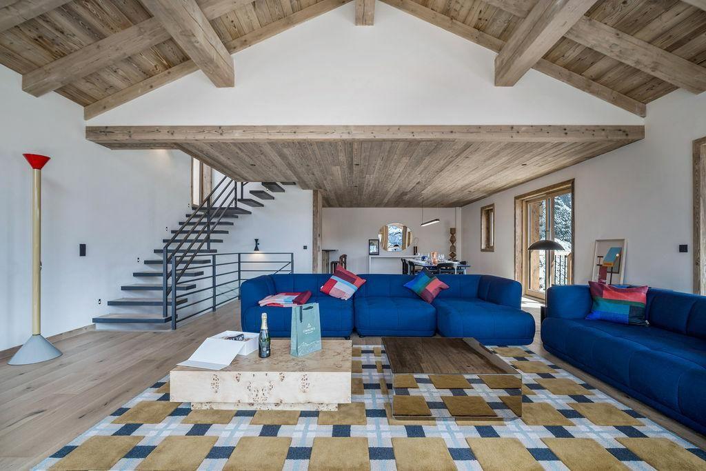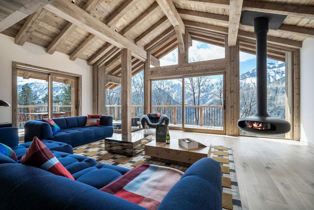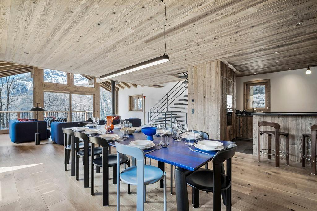 Thanks to incredible floor to ceiling windows on one side of the floor, Chalet Ouréa's open-plan living room presents a delightful mountain setting to reside to after a day on the slopes. The spacious room is bathed in natural light that floods through, helping to highlight the wooden beam structure and vaulted ceilings, which give a typical alpine feel to the space. After a tough ski day, take a moment to sit back and relax on the central sofas, designed for both comfort and to add a bold colour statement to otherwise neutral colours. It's here where guests can take full advantage of the suspended fireplace's warmth and gaze upon the mountain spectacle framed across the immense window wall. Towards the back of the room sits a contemporary dining table, colour matching with the blue sofas, for evening mealtimes. As you await the group's appointed cook to create a gourmet marvel in the kitchen, pour yourself a glass of wine at the breakfast bar or head to the balcony for sightseeing like no other.