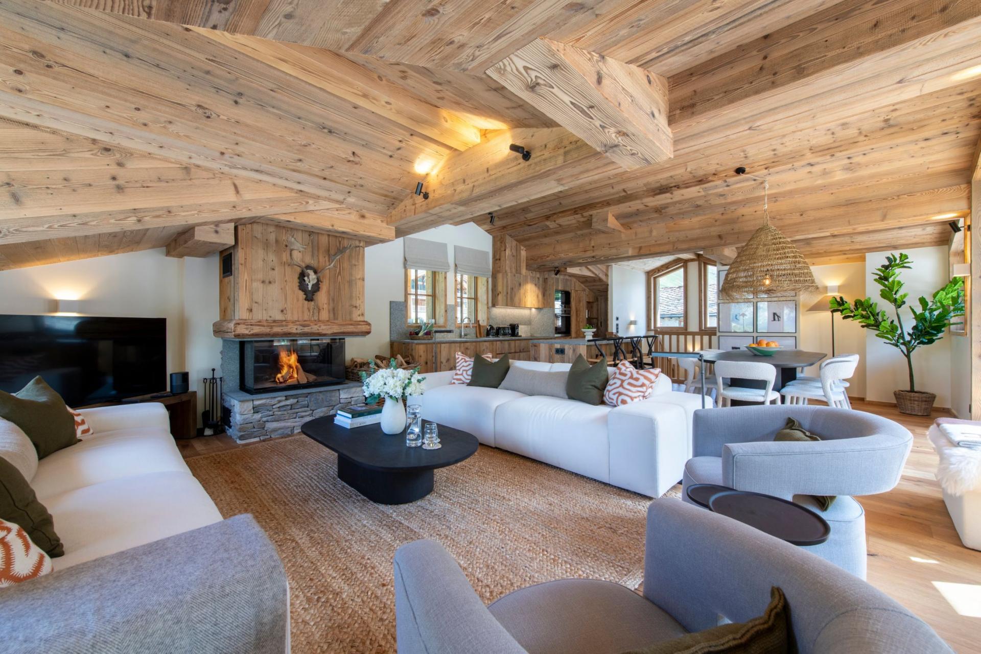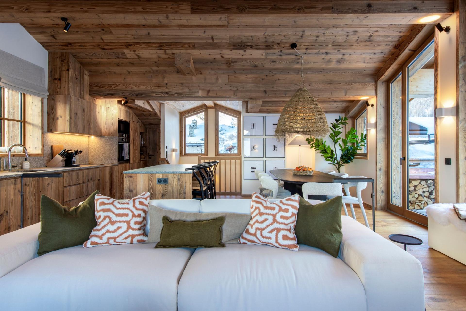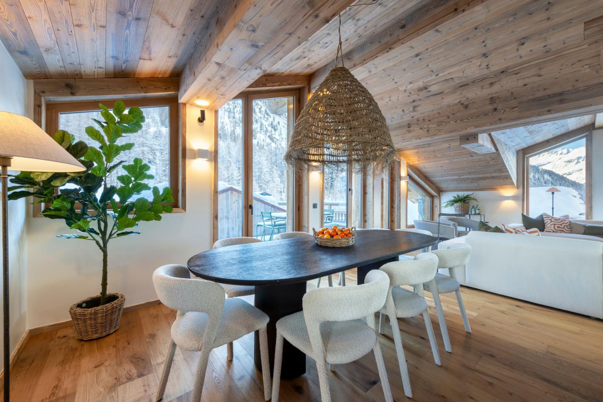 The top floor of the Arolay Penthouse holds the open-plan living, dining and kitchen area. Under the enchanting vaulted wood ceiling, a relaxing modern seating area, with sumptuous sink-in sofas and armchairs, gathers around the atmospheric log burning fireplace. Bespoke furnishings fill the space, decorated in exquisite fabrics from some of the world's most distinguished designers. Large floor to ceiling fitted windows illuminate the space with natural light, as well as showcasing the terrific top floor views of the Val d'Isère valley. Under an intricate wicker lampshade sits a dark oval-shaped dining table, the setting for your delicious home-cooked dinners. Beside the dining table is the kitchen's marble top island, with a breakfast bar and three bar stools, allowing you to keep your designated cook company. A tall glass door leads you onto the rooftop balcony, where an alfresco dining area awaits your arrival. Looking out on the snow swept trees and with panoramic views of the peaks that surround, it's the perfect spot to enjoy a glass of fizz after your exciting day racing around the mountains.