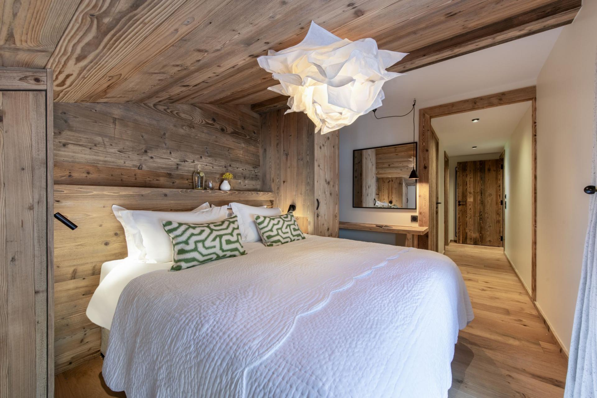 The lower floor of the Arolay Penthouse is dedicated to its four inviting en-suite bedrooms. Each bedroom is a cosy alpine refuge with thick mattresses and comforting blankets, ensuring a peaceful night's rest. The master bedroom is a double/twin room with a dressing area, access to a shared wrap-around balcony and a sleek en-suite bathroom. The two double bedrooms also have access to the shared balcony, and the last room is a double/twin room with an en-suite shower room.