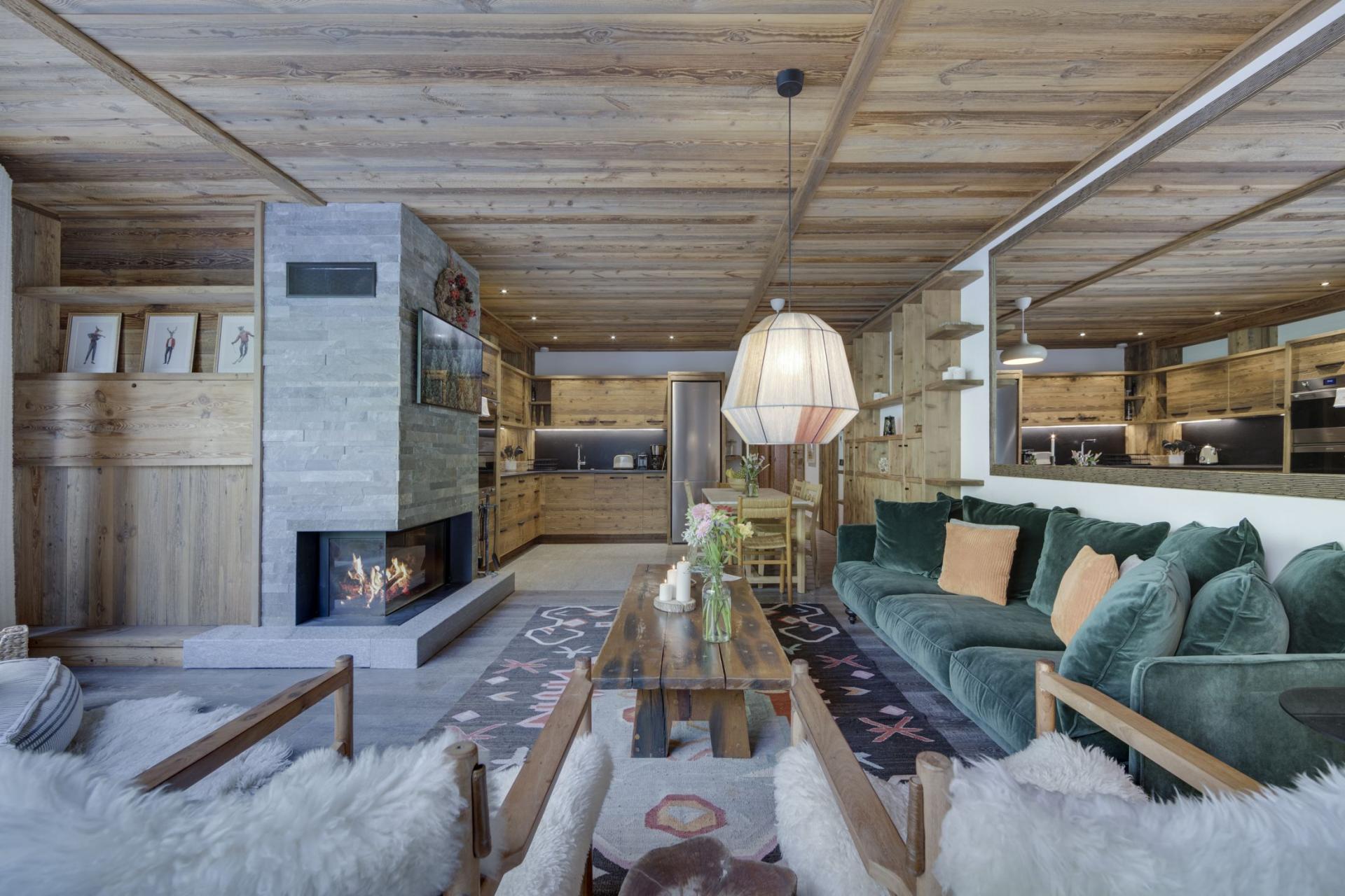 The open-plan living, dining and kitchen area offers plenty of space for guests to rest, with a cup of hot chocolate, after a hard day improving your ski technique. Designed in an alpine chic style, this spacious modern setting is perfect for families and friends to unwind together. A long deep sofa, against the back wall, and chairs with fur throws, wait readily to support your tired body. These are ideally positioned facing the floor to ceiling windows, allowing guests to look out over the terrace to the breathtaking backdrop of the mountain peaks and famous La Face piste. A decorative stone fireplace adds to the ambience in the room. In the evenings, a smart granite-topped dining table lies between the living area and the fully-equipped kitchen, seating 6 guests, perfect for making family meals to enjoy in the comfort of the apartment.