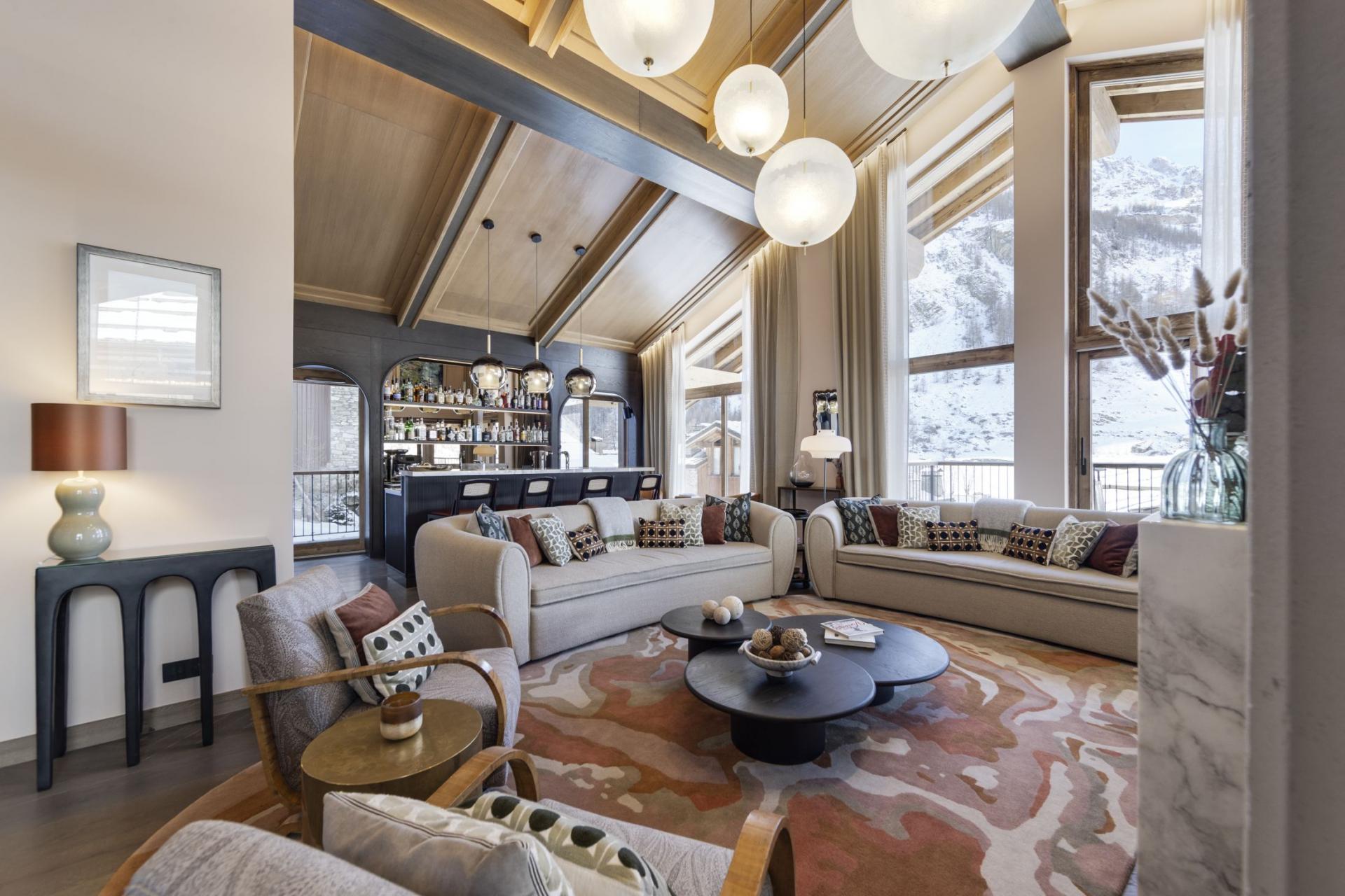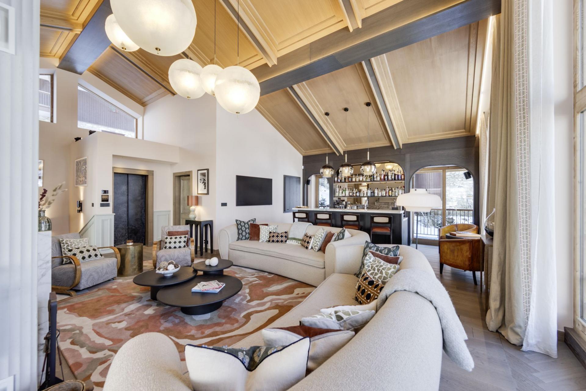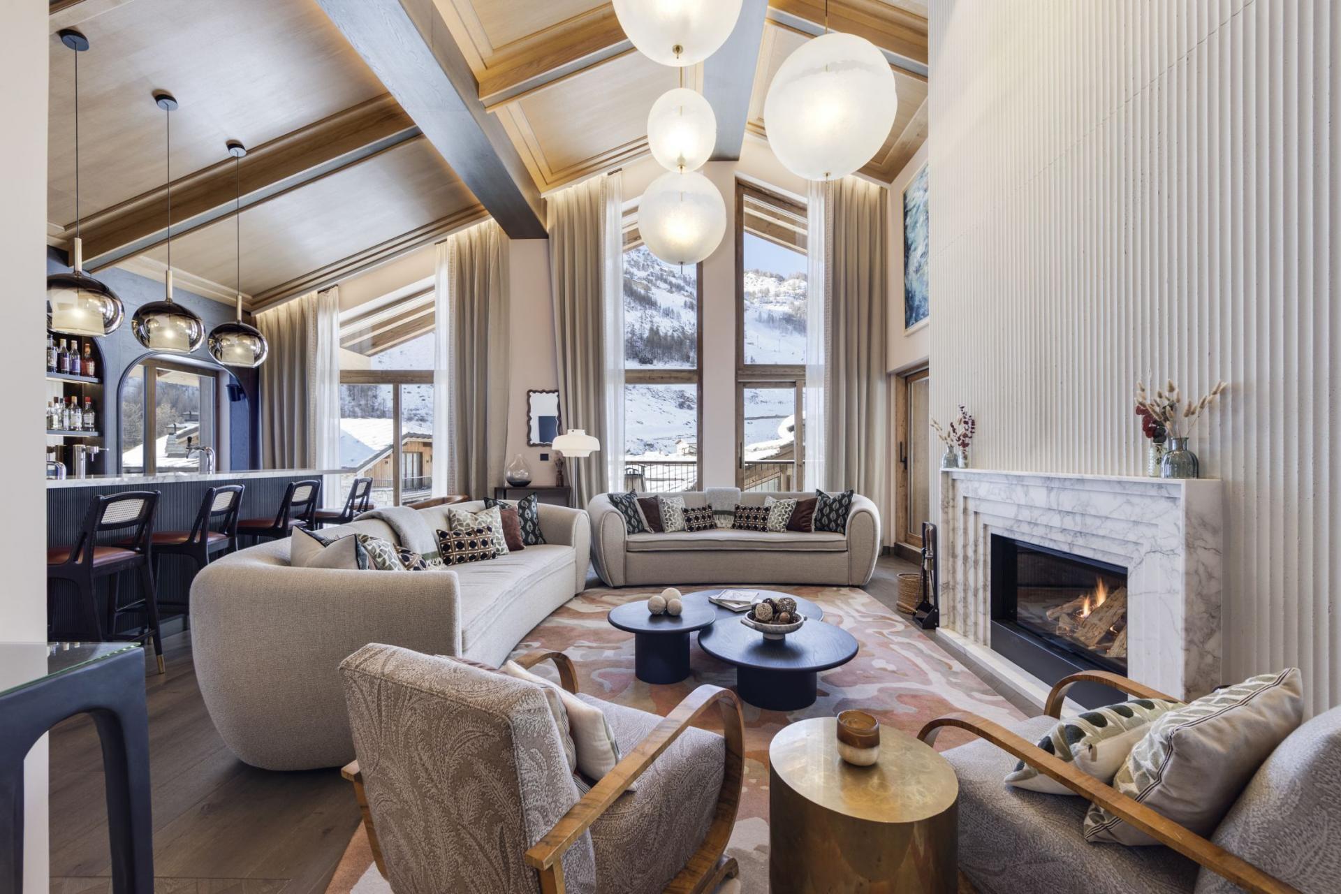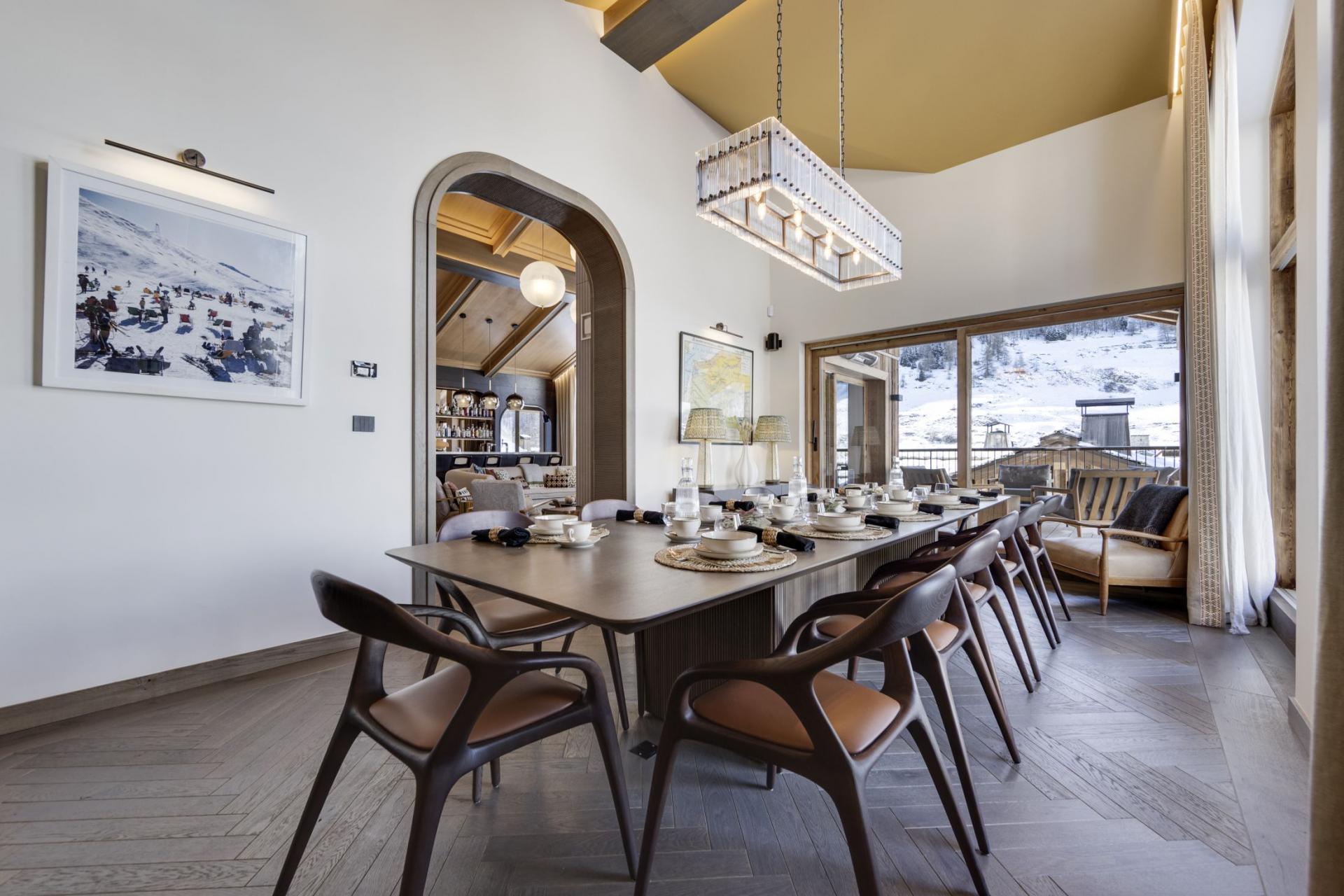 Occupying the top floor of the magnificent Chalet La Tene, the main living areas of the property offer a sumptuous space to gather after skiing. A spacious modern lounge area features contemporary sofas in front of a glamorous open fireplace. High, vaulted ceilings and tall windows open up the space further, while a chic bar area within the main living room allows you to make the most of the chalet's open drinks bar. Separate to the lounge is a grand dining room, with a long table that can seat up to 16 guests. A spacious balcony extends from both the lounge and dining areas, one of several across the chalet, with a prime view towards the famous Face de Bellevarde piste. The balconies offer the perfect location for après-ski drinks, watching skiers race by on the Santons piste that sits alongside the chalet.