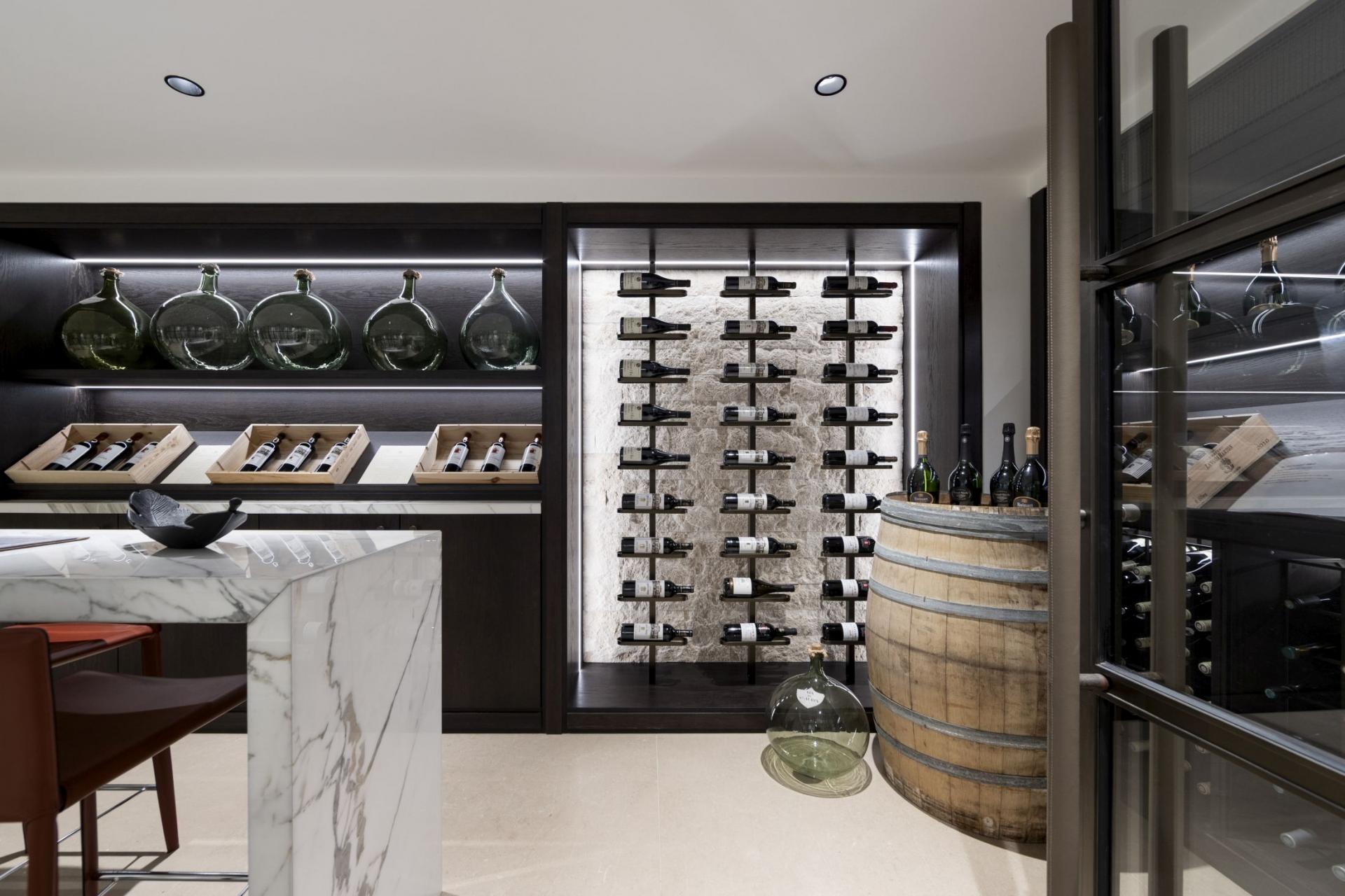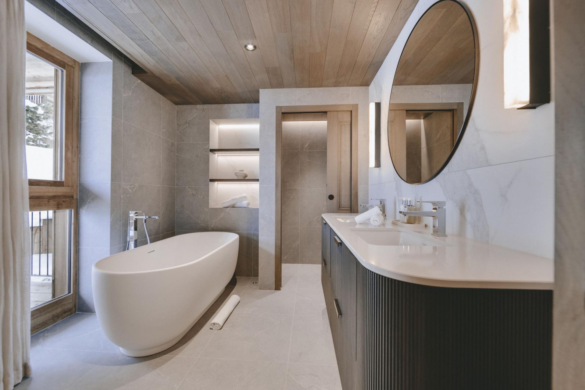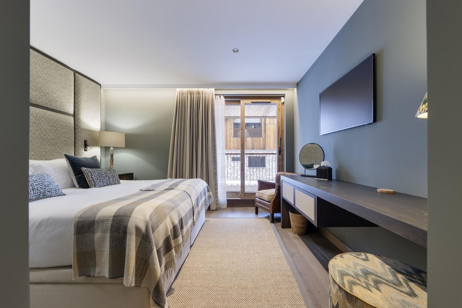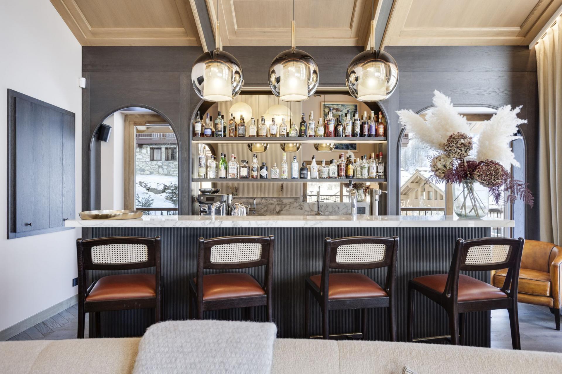 Occupying the top floor of the magnificent Chalet La Tene, the main living areas of the property offer a sumptuous space to gather after skiing. A spacious modern lounge area features contemporary sofas in front of a glamorous open fireplace. High, vaulted ceilings and tall windows open up the space further, while a chic bar area within the main living room allows you to make the most of the chalet's open drinks bar. Separate to the lounge is a grand dining room, with a long table that can seat up to 16 guests. A spacious balcony extends from both the lounge and dining areas, one of several across the chalet, with a prime view towards the famous Face de Bellevarde piste. The balconies offer the perfect location for après-ski drinks, watching skiers race by on the Santons piste that sits alongside the chalet.