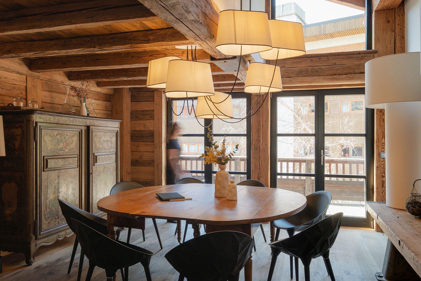 The spectacular open-plan living space of Kilco Penthouse features reclaimed wood beams and sweeping views of the mountains. The lounge area sits in a double height space with windows that draw in the mountains that surround the village and an open fireplace - it is a great space to relax after a long day skiing. The dining area sits separate to the lounge area, creating the perfect set up for a gourmet dinner. There is also a small raised bar table for those looking to relax with a drink before your evening meal, as preparations are conducted by your chalet team in the separate fully-equipped kitchen.