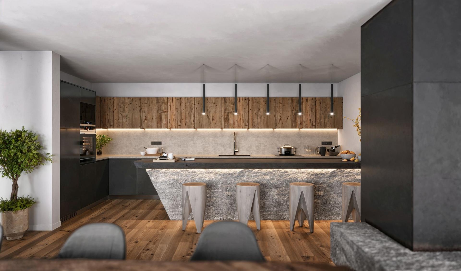 Chalet Breithorn's main living area is a stunning open-plan space centred around a feature fireplace in the middle of the room, around which you will find lounge areas, a dining space, kitchen, and bar area. Sleek alpine woods, matte black finishes, and exposed stone are all utilised in a sharp design, in this spacious room that contains furnishings of the highest quality. The lounge and dining spaces are positioned beneath a tall, vaulted wooden ceiling, with towering windows that flood the space with natural light. The fully-equipped kitchen and chic bar area are then situated behind, with soft lighting that helps create a soothing atmosphere. A balcony spans the breadth of these living areas, granting you a pleasant area to enjoy a morning coffee and drink in the surrounding mountain views.