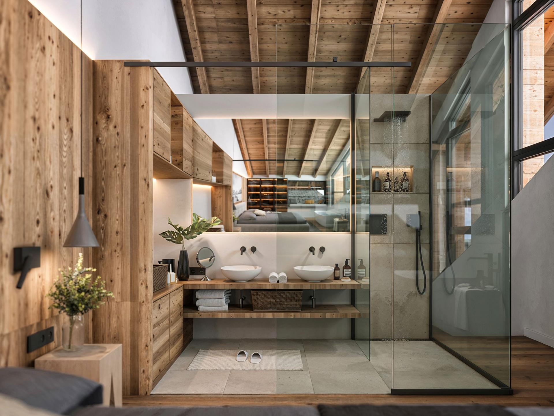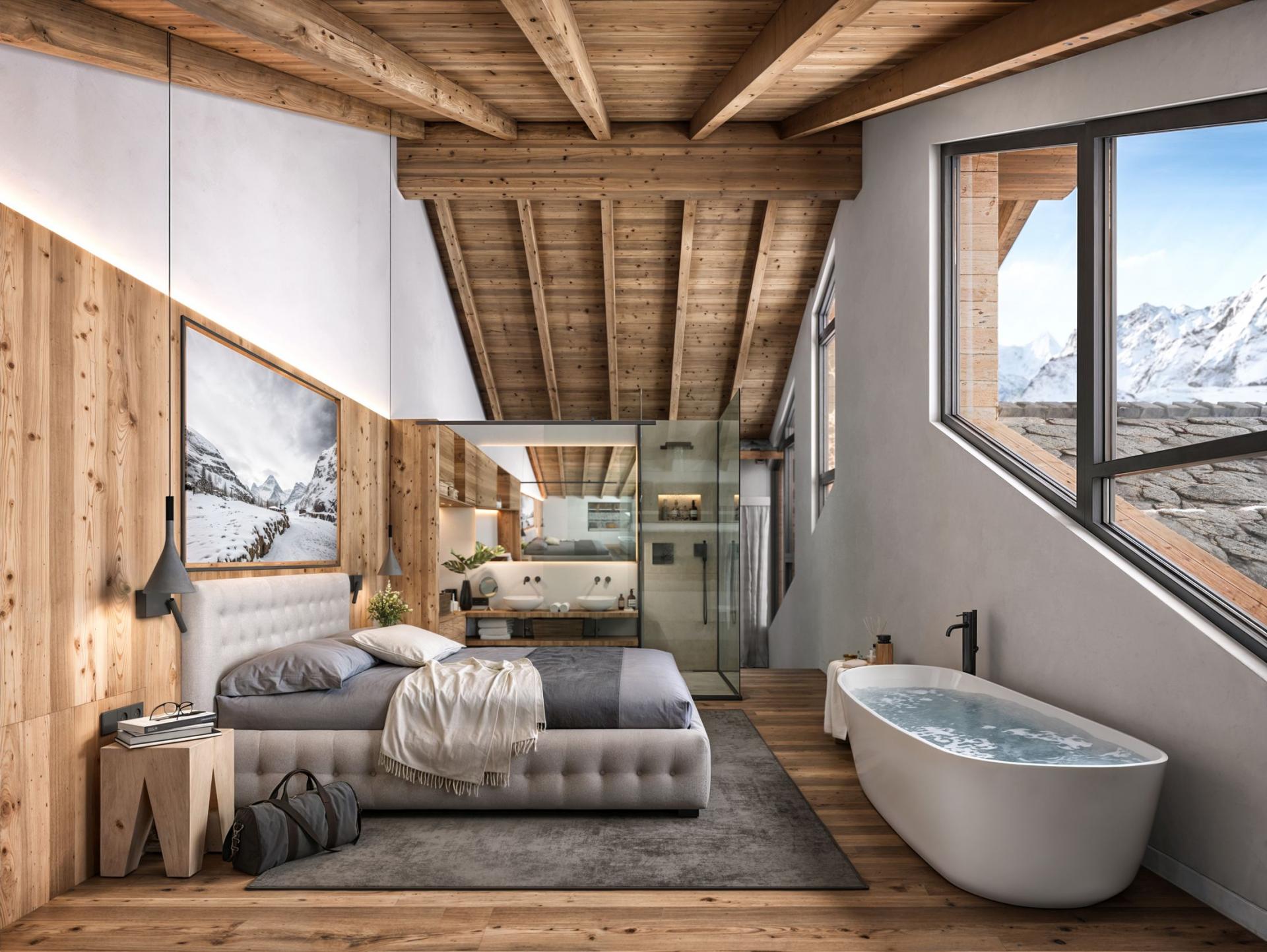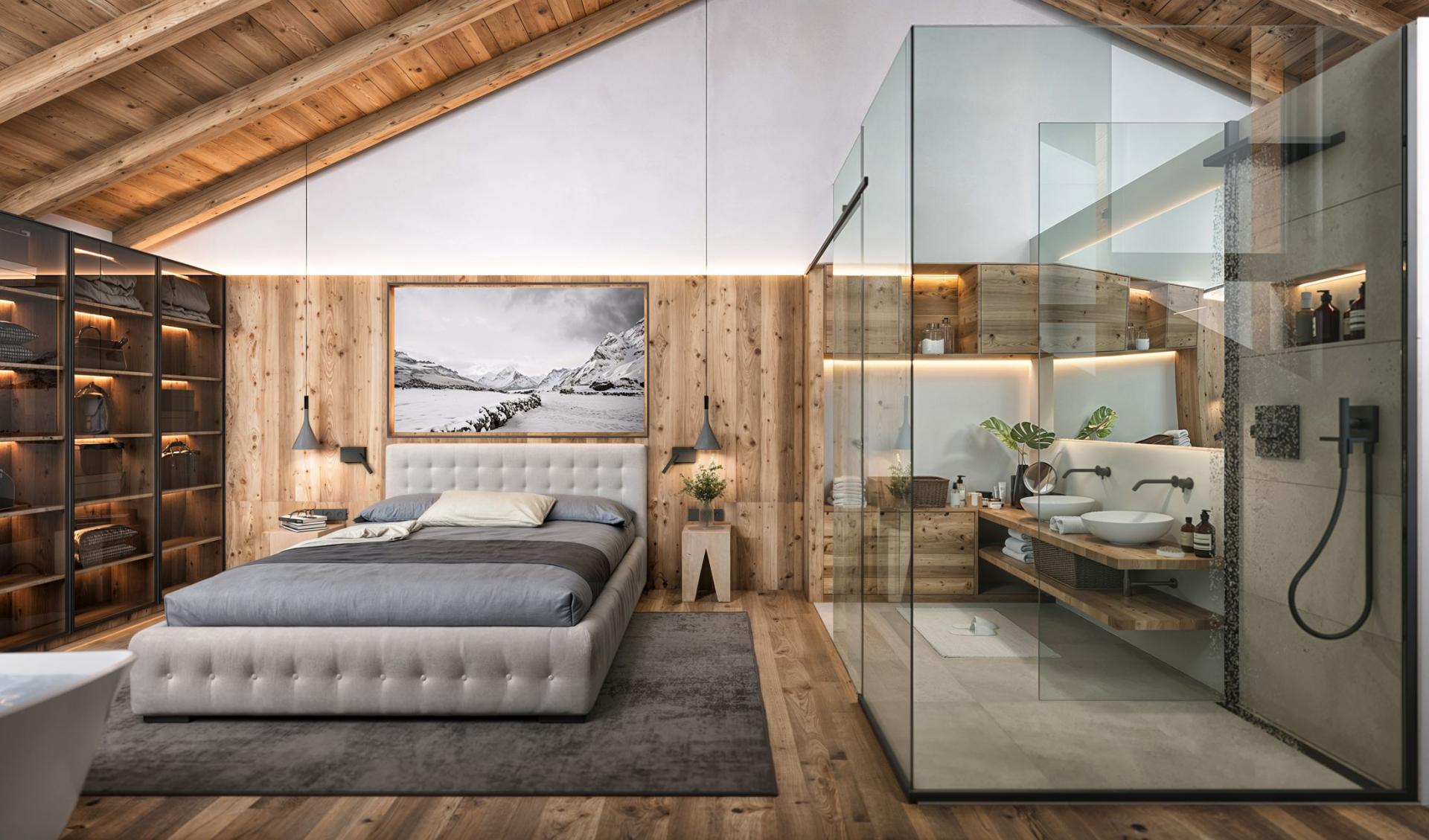 Chalet Breithorn has 6 double bedroom suites, offering the capacity to sleep up to 12 guests overall. Each of the 6 bedrooms are named for a mighty mountain peak, and have elegant alpine designs to match. A master suite takes pride of place on its own floor at the top of the chalet, with a freestanding bathtub, open-plan shower room, and office area attached. The other bedrooms all offer outside access to either a terrace or balcony and are completed by luxurious en-suite facilities.