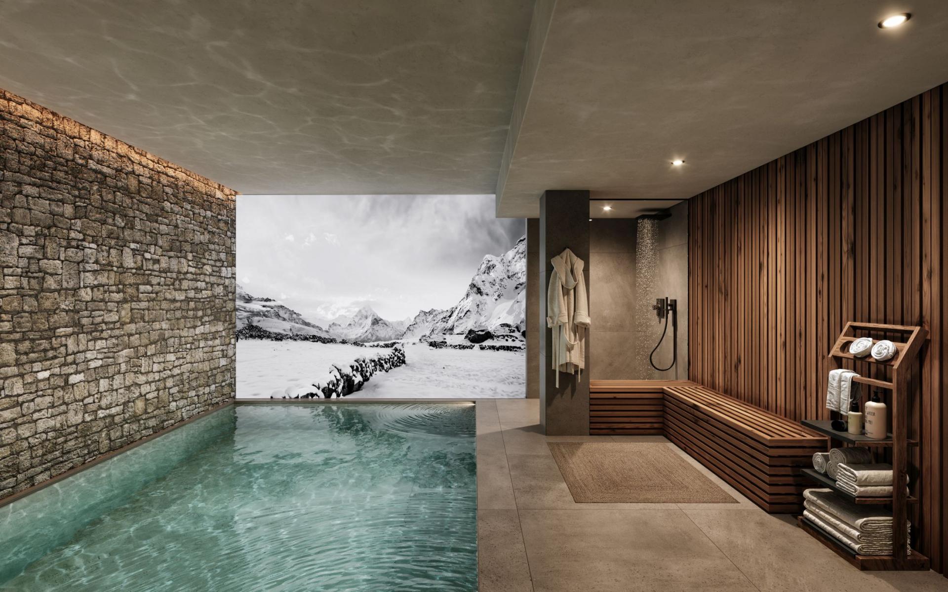 Across its lower levels, Chalet Breithorn features a range of excellent spa facilities, making this chalet a truly special option for wellness escapes to the mountains. A 6m heated indoor swimming pool occupies its own space on the lowest floor, with the rest of the spa facilities found in the wellness area on the floor above. Here, unwind in the comforting embrace of the indoor hot tub, rejuvenate in the traditional Finnish sauna, or indulge in a special treatment with the massage area. Found alongside the hot tub, sauna, and massage table are some gym equipment.