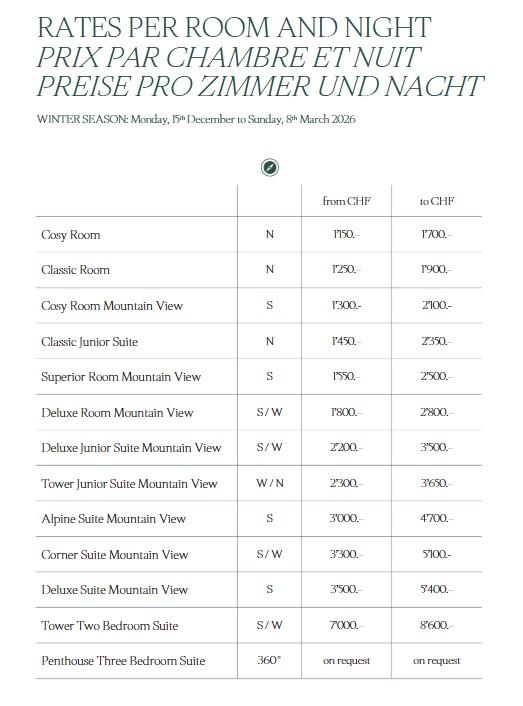 Prices are based on double occupancy for the lowest category "Cosy Rooms". Rates include complimentary daily breakfast, a daily culinary credit for lunch or dinner in La Grand Terrasse or Le Grand Restaurant of CHF 110 per person, use of the hotel facilities and spa, shuttle transfer to/from Gstaad railway station and all taxes.
