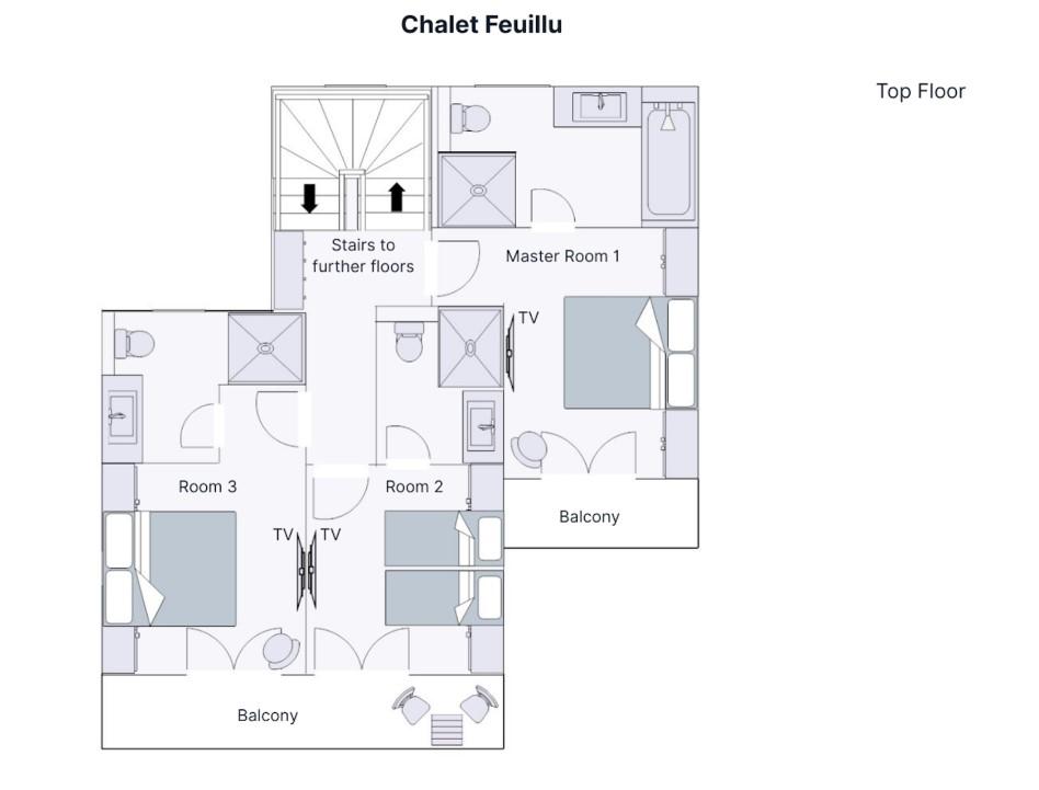 The three bedrooms of Chalet Feuillu are all found on the top floor of the chalet. Wooden architecture, stone bath and shower rooms and soft furnishings give the bedrooms a much more cosy alpine feel than the more modern living spaces. The perfect setting for when you want to rest up for the night. One of the double bedrooms can also be configured as a twin room for added flexibility, while all of them have access to a private or shared balcony space with a greater vantage point to admire the tremendous views.