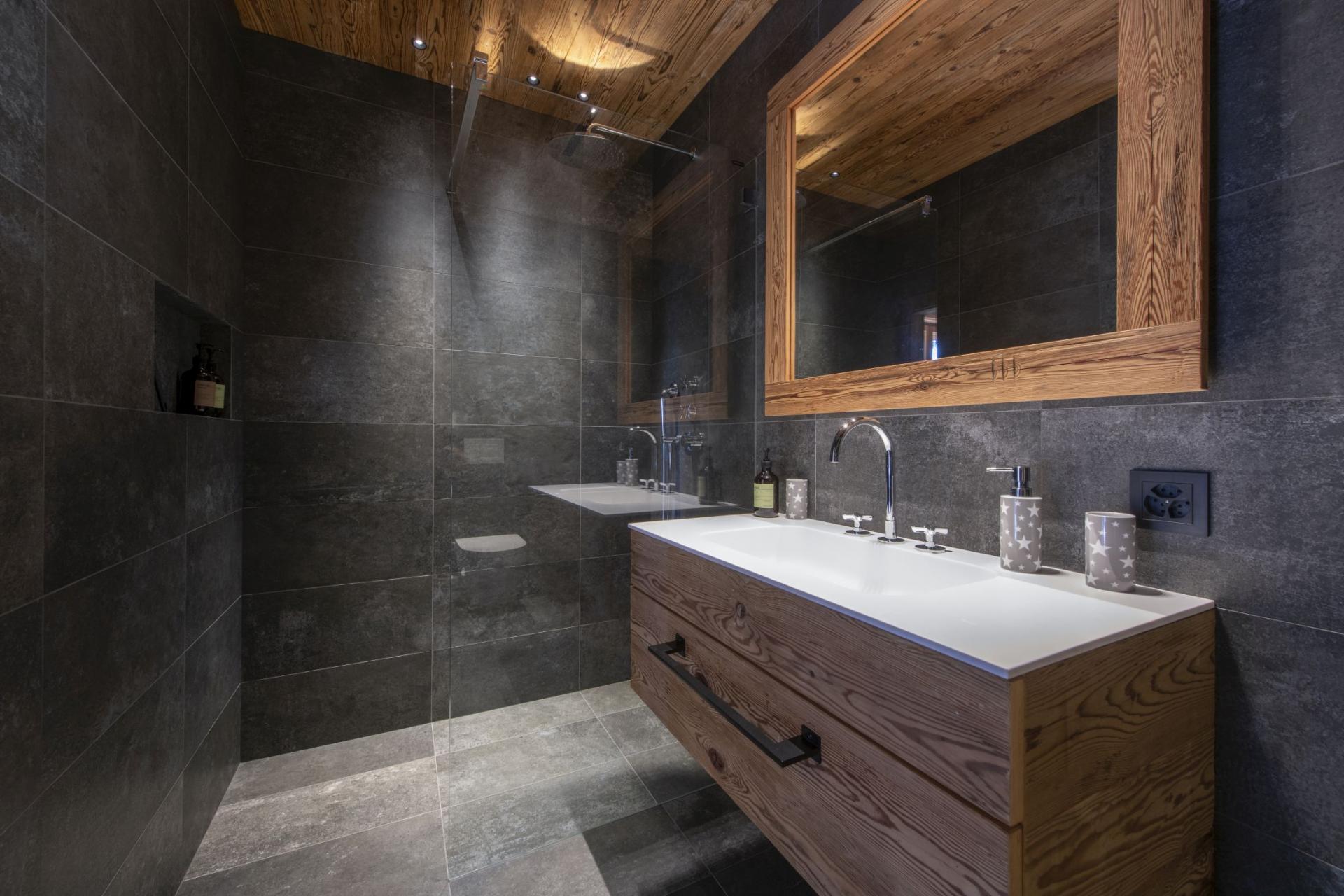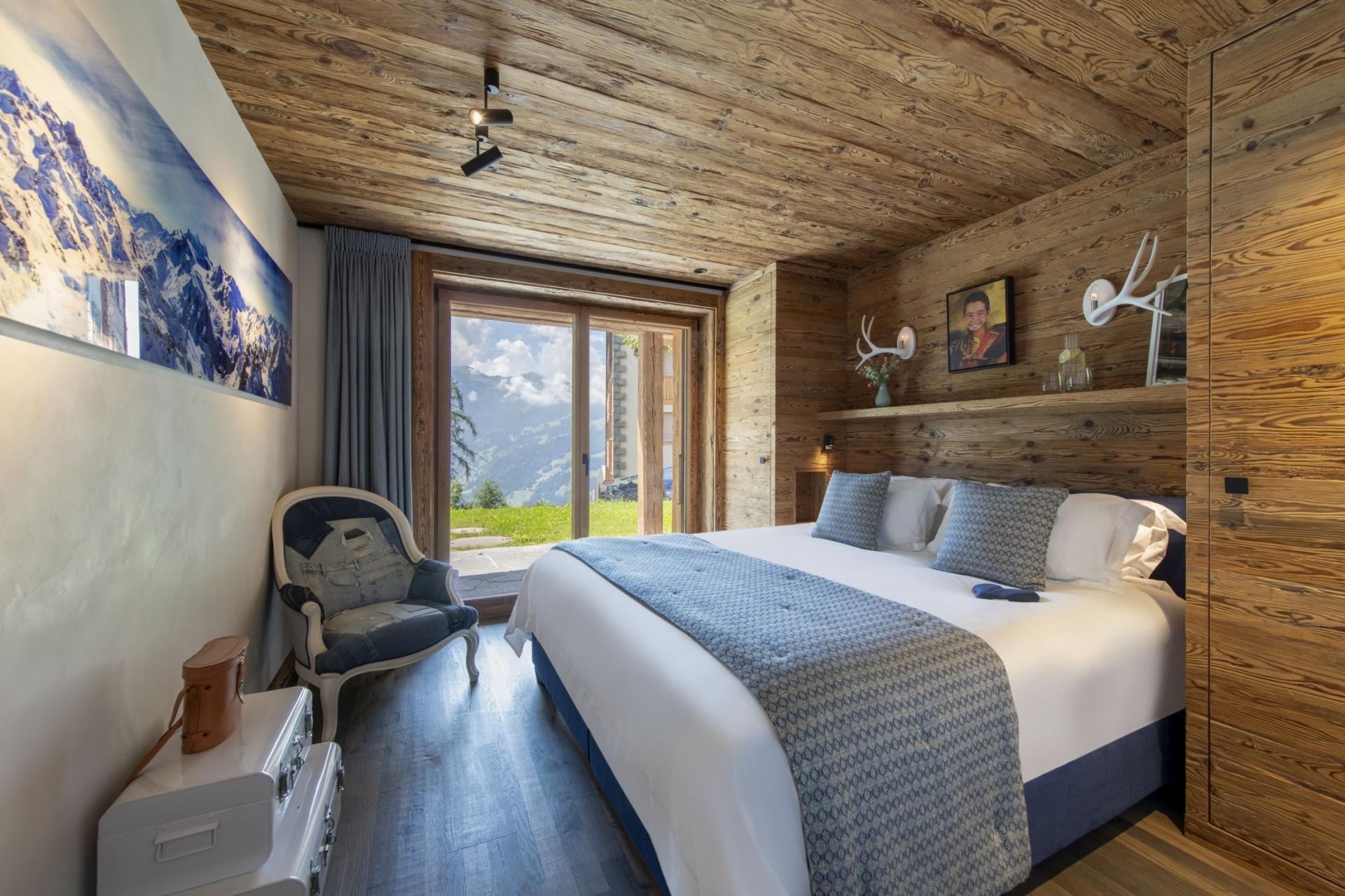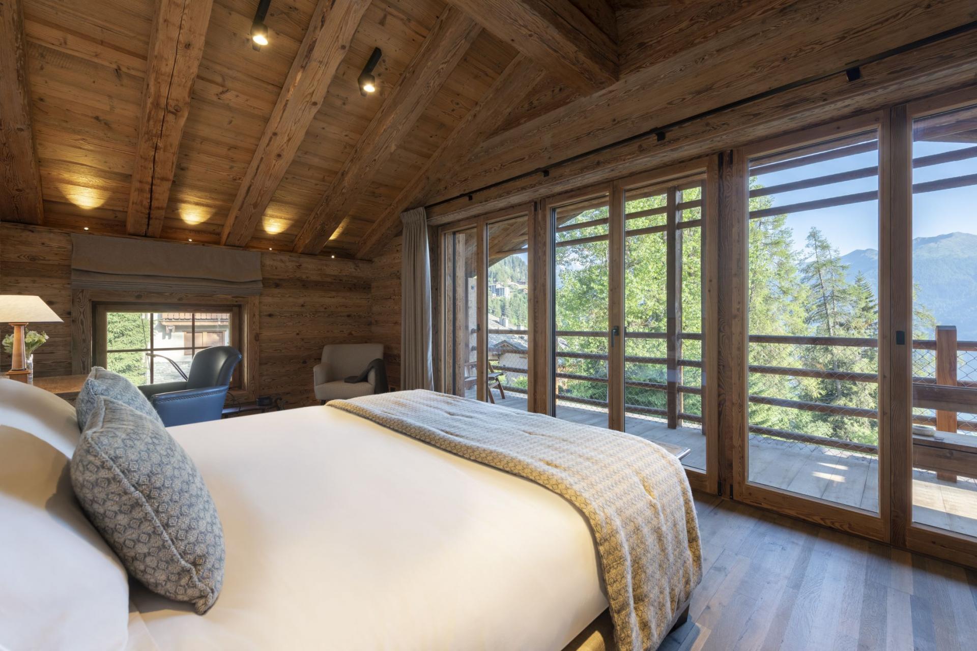 In total, Chalet Peter Pan accommodates up to 14 guests across six en-suite bedrooms spread throughout the chalet. The bedrooms follow a similar alpine opulence to the rest of the chalet, owing to modern furnishings that fill the room, wooden cladding and neutral colour palettes. South-facing windows illuminate the bedrooms, whilst also showcasing views of the Swiss Alps and leading out onto balconies or terraces. Alongside five doubles, there's also a children's bunk bedroom (sleeping 4 guests) on the ground floor, making this chalet perfect for a family ski holiday.