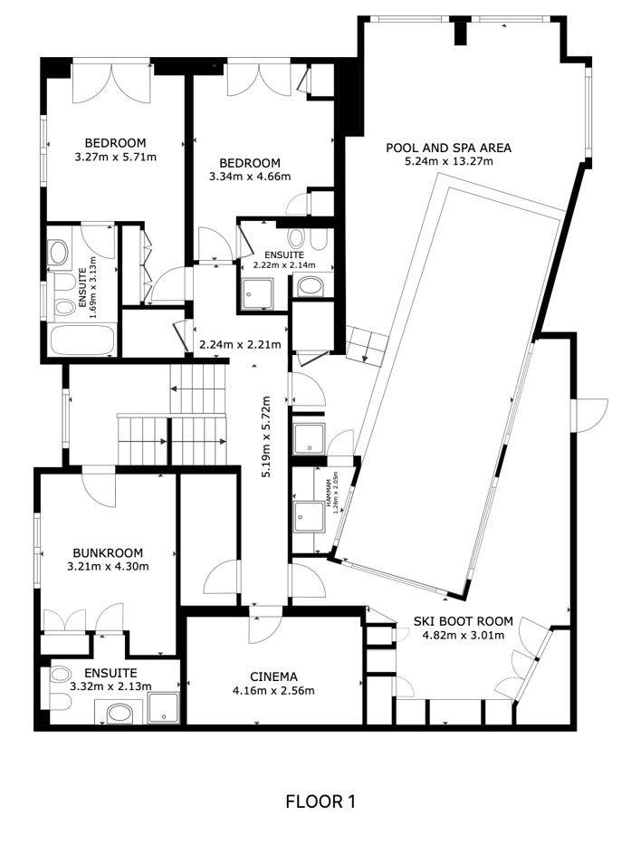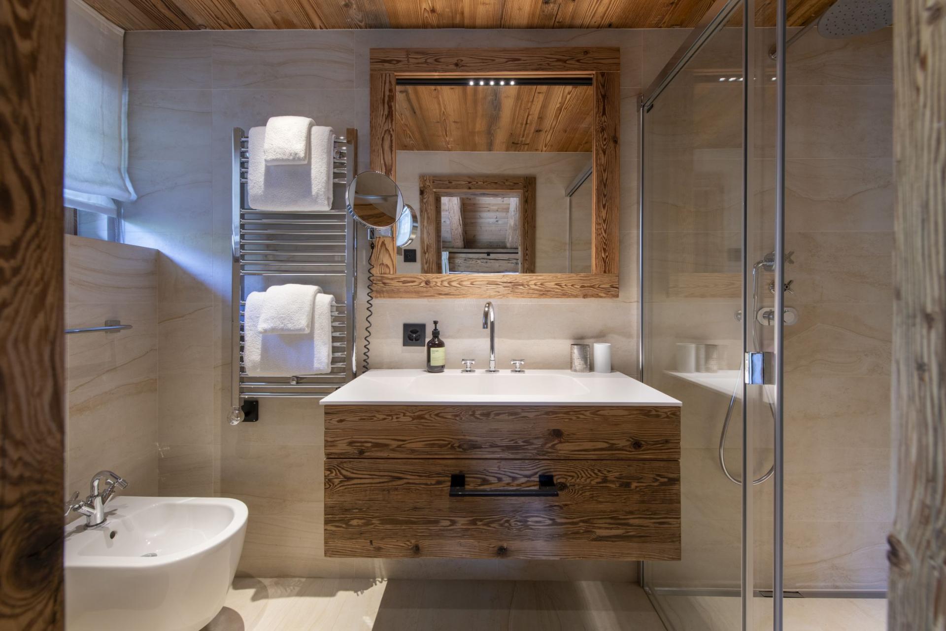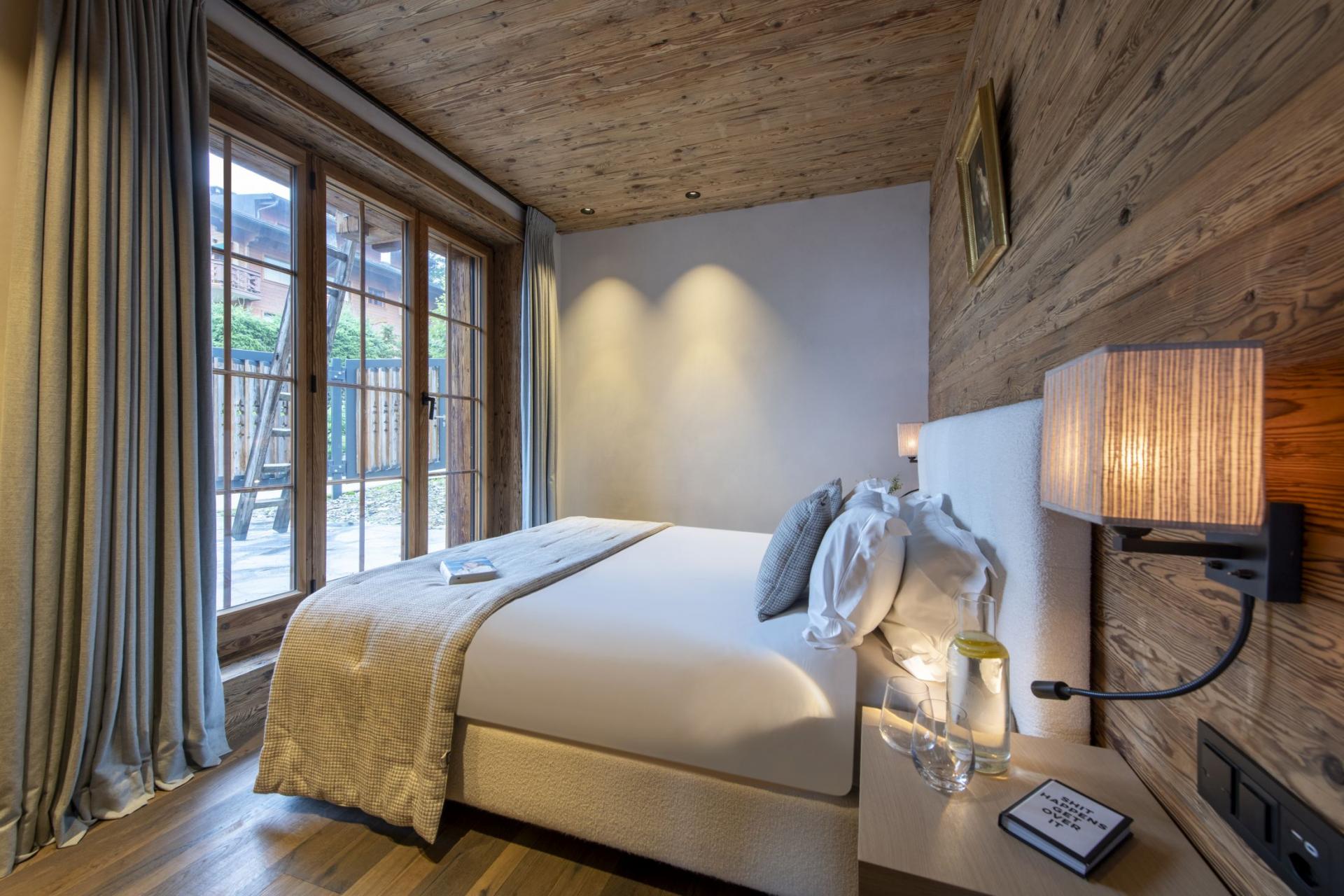 In total, Chalet Peter Pan accommodates up to 14 guests across six en-suite bedrooms spread throughout the chalet. The bedrooms follow a similar alpine opulence to the rest of the chalet, owing to modern furnishings that fill the room, wooden cladding and neutral colour palettes. South-facing windows illuminate the bedrooms, whilst also showcasing views of the Swiss Alps and leading out onto balconies or terraces. Alongside five doubles, there's also a children's bunk bedroom (sleeping 4 guests) on the ground floor, making this chalet perfect for a family ski holiday.