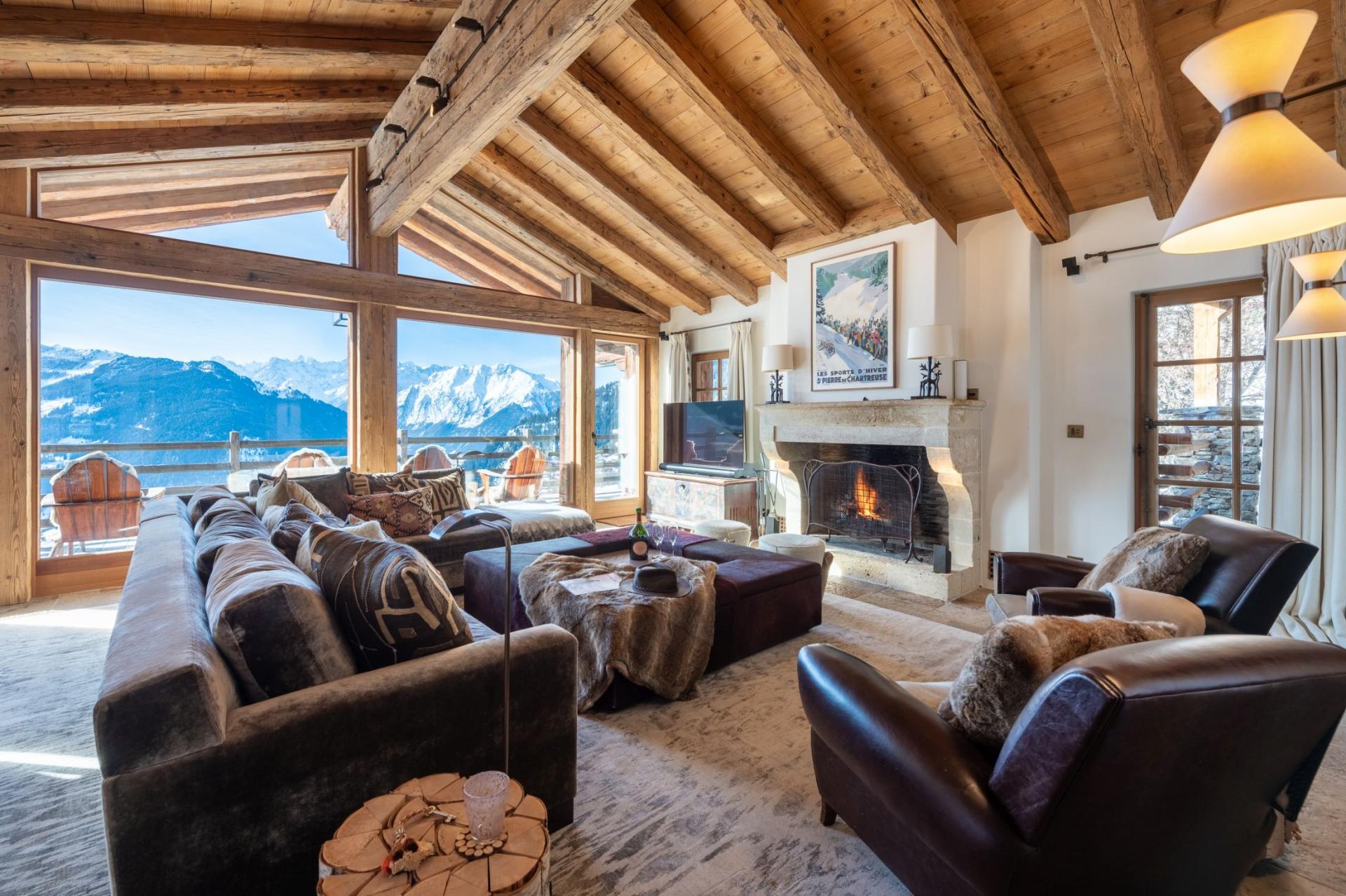 As you enter through Chalet Virmadisa's main front door, guests will be welcomed into a warm and wonderful Alpine chalet environment, home to the main living floor. Plenty of natural light pours in through the window wall found to the back of this living space, looking out to the terrace area and rugged mountain range shaping the skyline in the distance. This, combined with high rustic wooden ceilings, light décor and homely furnishings, presents an inviting area to warm in front of the wood-burning fireplace or TV, with ample sofa space for the whole group. Behind the sofa, there is a desk available for guests required to catch up on any missed business, yet still wishing to be involved with the group's after-ski discussions.