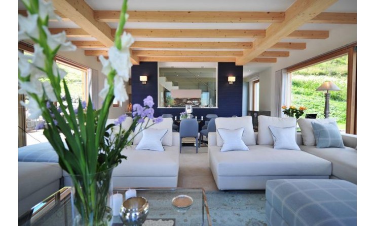 The first floor of the house comprises a beautiful sitting room and dining room with panoramic views, a kitchen and a small study area. There are lovely gardens around the house, a breakfast terrace and main terrace with a fire pit for those cool summer evenings, or for champagne in the snow. There is also a separate outdoor yoga deck cut into the mountain slope for those wishing to practice yoga, Pilates or simply stretch or exercise standing on top of the world.