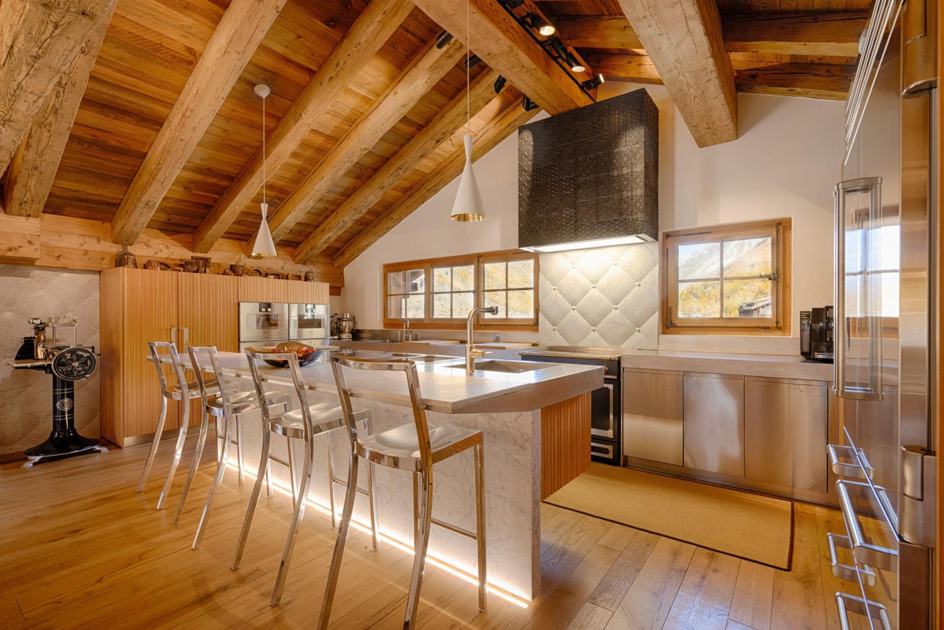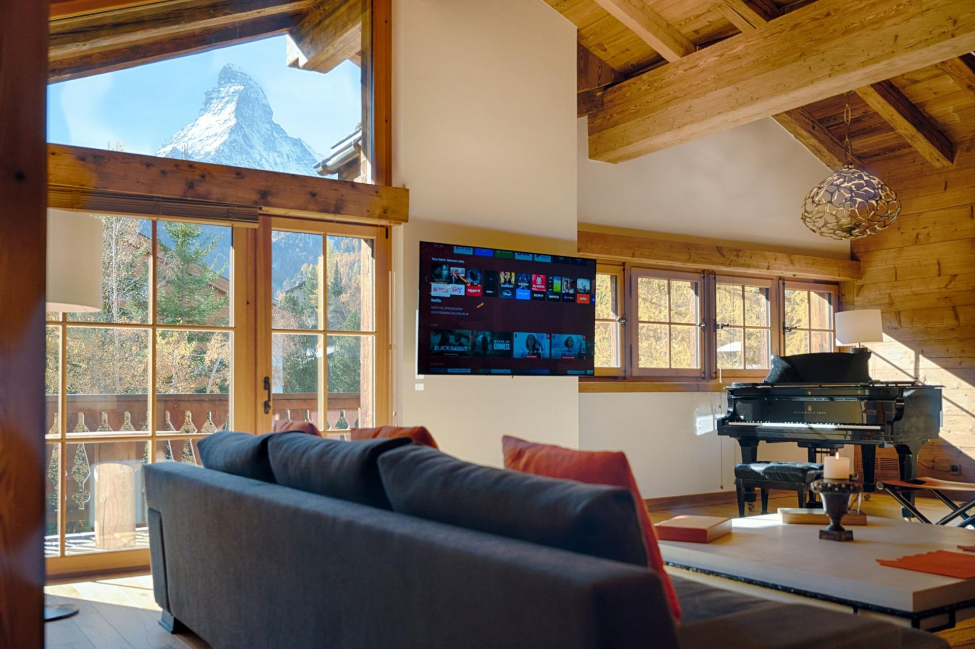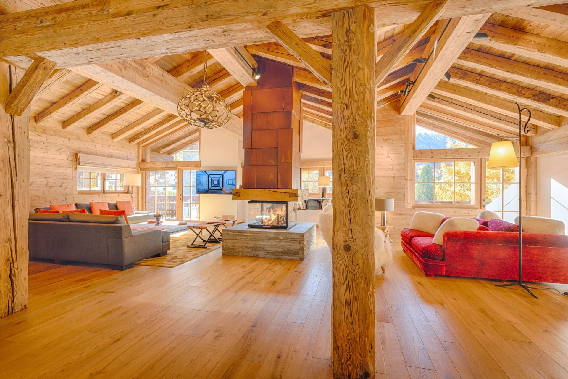 Across the top floor of Chalet Kemaura, you will discover a palatial open-plan living space. This airy loft-like space features high, vaulted ceilings and authentic wood interiors as expected of a classic alpine chalet. A chic fireplace takes centre stage in the heart of the room, where stylish designer sofas sit either side, benefiting from the soothing warmth of the crackling log fire and offering several options for relaxing in comfort. A multitude of windows let in natural light, also framing those all important picture-perfect Matterhorn views, while a baby grand piano adds another touch of sophistication to the room. Set behind the lounge areas, still in this open-plan room, you'll find Chalet Kemaura's classy dining and kitchen area. The dining table is sizeable, with further seating to be found along the large kitchen island behind. The property also benefits from several balconies and a terrace/garden area, providing you with a delightful spot for an apéritif and admire the majestic views.