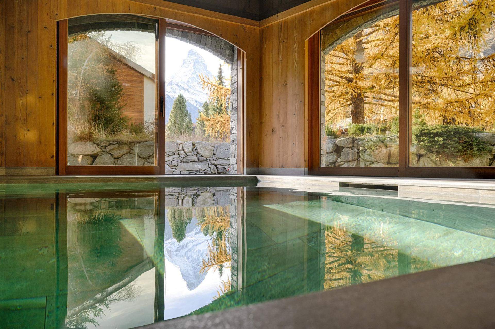 Chalet Kemaura in Zermatt is a spectacular property; a 750m² luxury chalet with swimming pool with an elegant alpine charm and abundance of spa features. This 7-bedroom chalet in Zermatt welcomes groups of up to 14 guests, and is one of the premier options in this world-class ski resort.